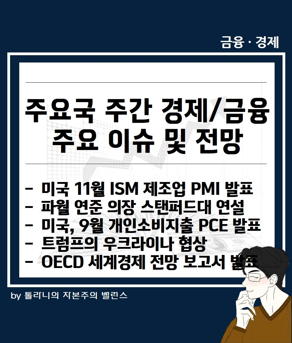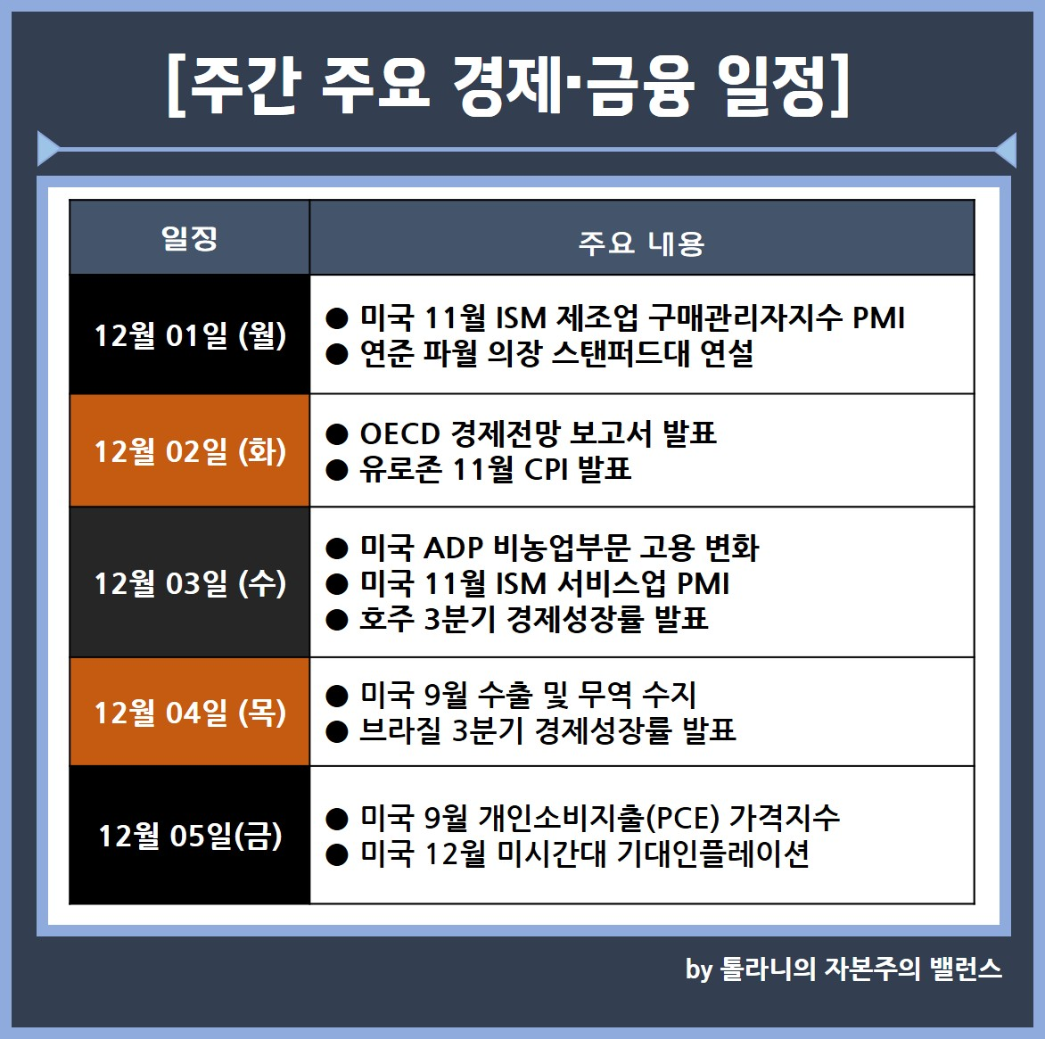 이에 '미국 9월 PCE 및 11월 민간고용, ISM 제조업 PMI 지수 발표 등 주간 증시 일정 및 주요 국가 경제·금융 이슈' 관련하여 언론 보도 및 국제금융센터 보고서를 통해 좀 더 자세히 알아보도록 하겠습니다.