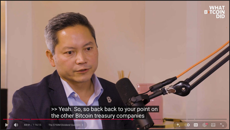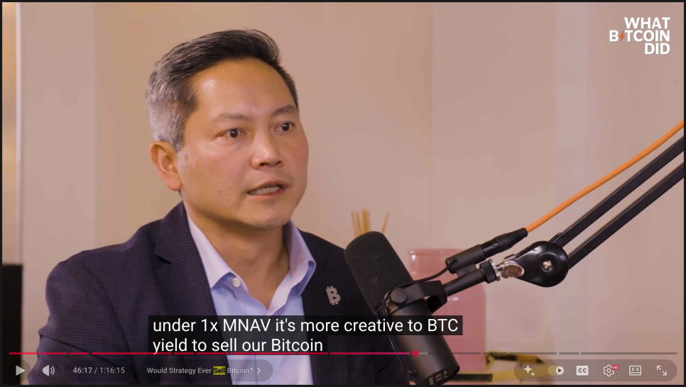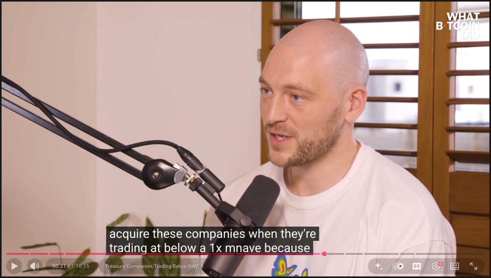 한편 팟캐스트 호스트는 최근 일부 비트코인 재무 기업이 MNAV 1 아래에서 거래되는 상황에 대해서, 다른 기업들을 인수할 가능성이 있는지에 대해서도 물어봣습니다. 왜냐면, 기업이 보유한 비트코인 자산보다도 주식 가격이 싼 상황이기 때문에 해당 기업을 인수해 버리면 이론적으로는 비트코인을 싼 값에 살 수 있다는 결론에 다다를 수 있기 때문인데요.