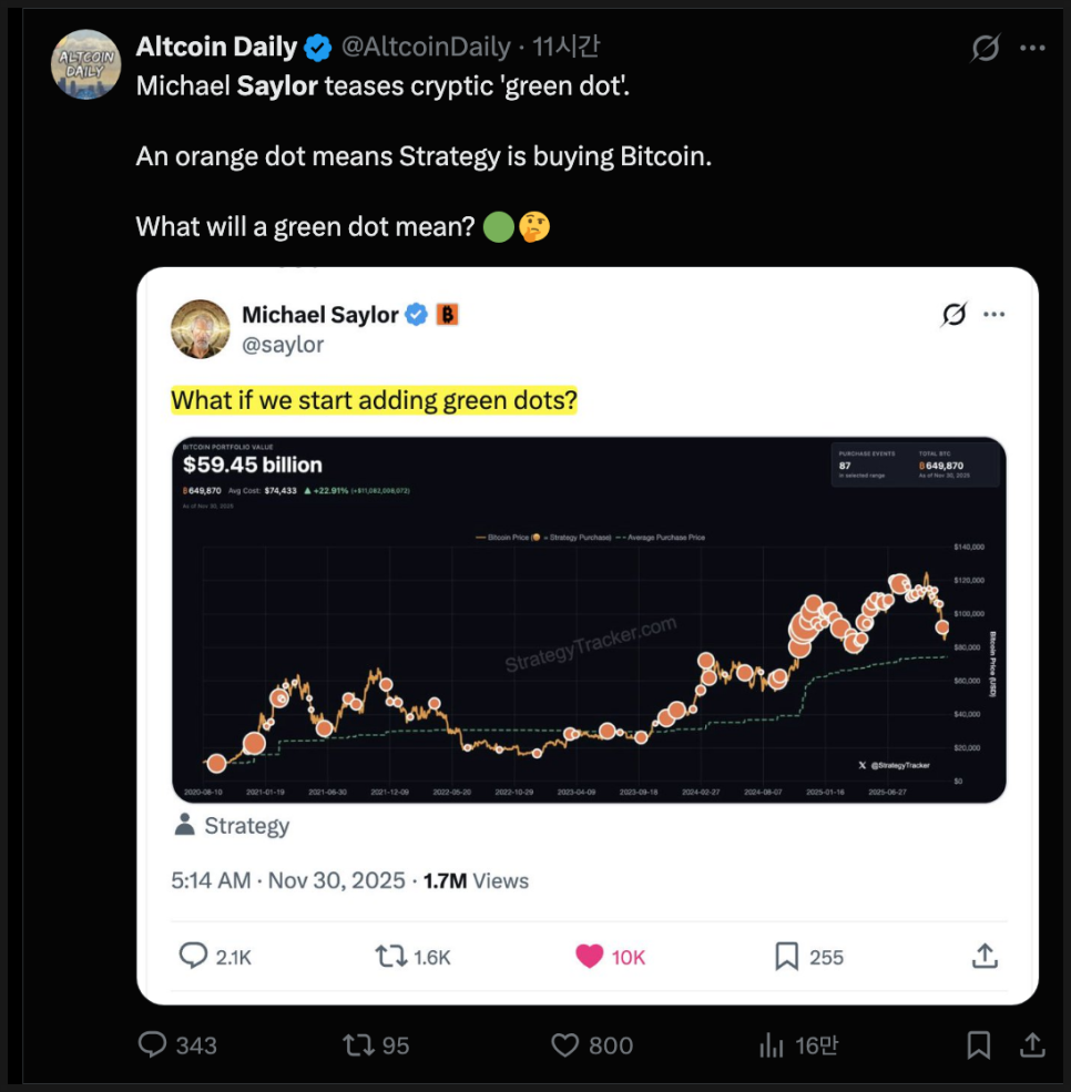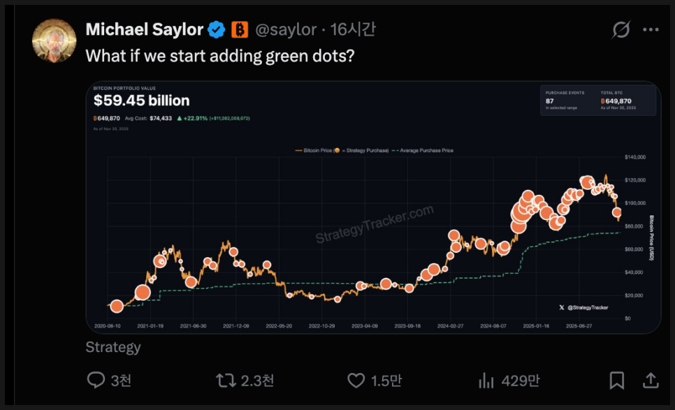 비트코인 기업인 스트래티지(MSTR)의 마이클 세일러(Michael Saylor) 의 일요일 X 게시물 패턴이 이번 주에 조금 달라졌습니다. 지난 1년 동안 세일러는 거의 매주 일요일마다 오렌지색 점이 찍힌 차트를 올리면서, 다음 날 월요일에 비트코인을 추가 매수한다는 신호처럼 보이게 행동해 왔는데요. 이번에는 같은 차트를 올리면서 “이제 초록색 점을 찍는다면 어떨까”라는 문장을 덧붙였습니다.