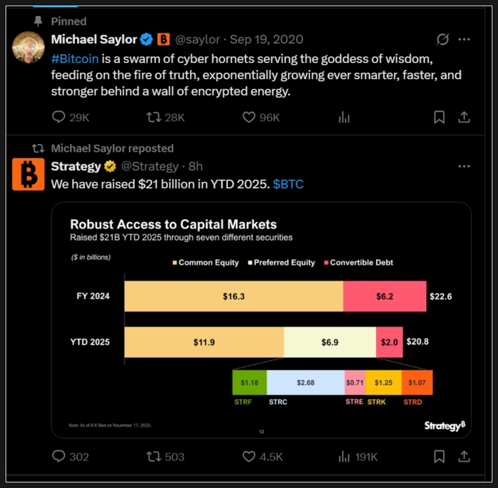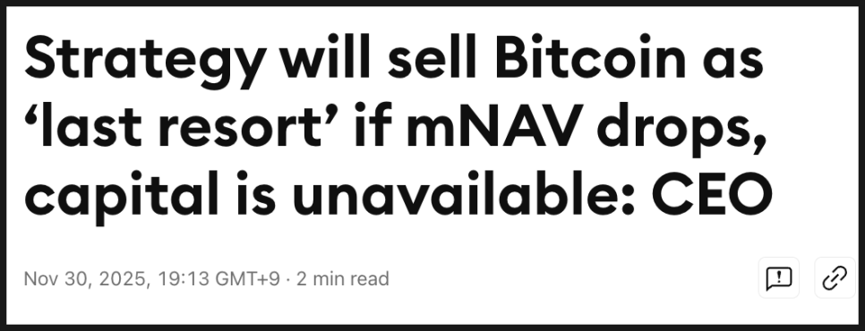 해당 발언은 헤드라인이 되어 기사로 뽑혔고, 몇몇 투자자들은 우려를 표하고 있습니다. 최근 몇 달 동안 스트래티지의 주가는 크게 하락하면서, 예전처럼 보통주를 발행해 자금을 조달하는 방식이 어려워졌고, 최근에는 우선주 발행을 통해 비트코인을 사들이는 전략을 쓰고 있죠. 그 결과, 시장에서는 우선주 배당을 지급할 능력이 충분한지, 혹은 그 부담 때문에 결국 비트코인을 팔게 되는 것은 아닌지에 대해 의문을 제기하고 있는 상황이죠.