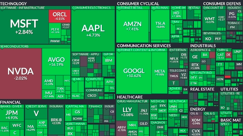 이번 상승을 주도한 것은 대형 기술주였습니다. 증시 맵을 보면 마이크로소프트가 2.84퍼센트 오르며 안정적인 흐름을 보였고 애플은 4.73퍼센트 상승해 투자 심리 회복을 견인했습니다. 아마존은 7.41퍼센트 상승했고 테슬라는 8.48퍼센트 오르면서 소비 관련 성장주의 상승폭이 눈에 띄었습니다. 특히 구글은 10.62퍼센트, 메타는 9.89퍼센트나 상승하며 시장에서 AI 중심 빅테크 기업들에 대한 기대가 여전히 견고함을 보여주었습니다.
