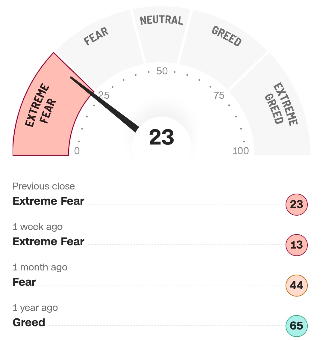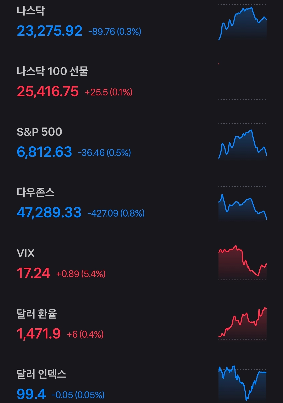 오늘 미국 주요 지수들은 모두 약세로 마감했습니다. 나스닥은 0.3% 하락했고 S&P 500은 0.5% 떨어졌으며 다우지수 역시 0.8% 하락해 전반적으로 약한 흐름이 이어졌습니다. VIX 지수가 상승하면서 시장 변동성이 확대되었고 달러 환율은 소폭 오르며 금리 및 통화 환경의 불확실성이 확인되는 흐름입니다. 공포탐욕지수가 23으로 극단적 공포 영역에 머물러 시장 심리가 위축된 상태가 그대로 드러났습니다.