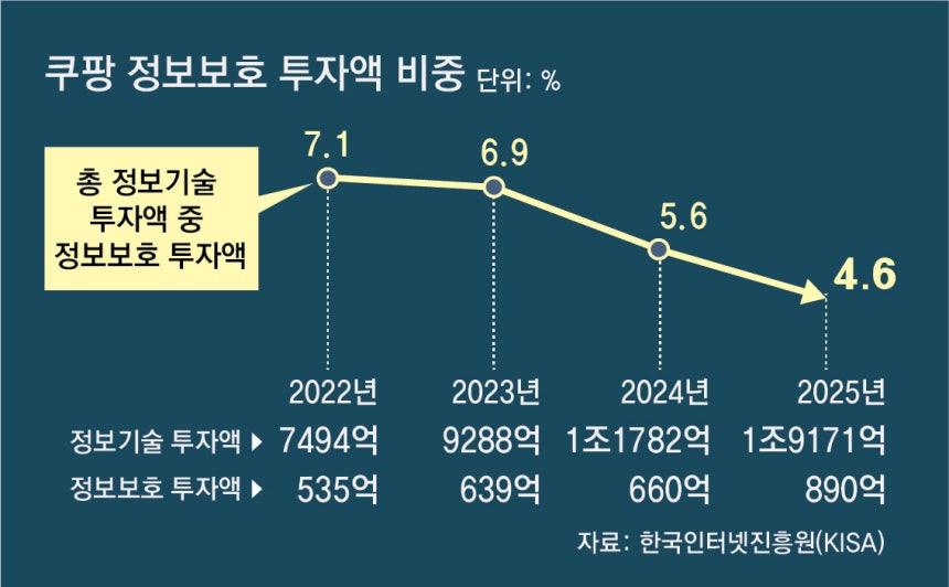 이런 가운데 쿠팡은 최근 4년간 IT 대비 정보보호 투자 금액을 줄여온 것으로 파악됐음