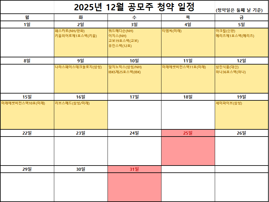 이번 달은 다양한 업종이 청약을 진행하고 특히 스팩주의 비중이 높은 편이라 종목 간 온도 차이가 클 수 있는 환경입니다. 연말에는 기관 수요예측이 보수적으로 흘러가는 경우가 많고 자금 회수 움직임도 증가하는 시기라 확정 공모가와 경쟁률 발표가 청약 여부를 결정하는 데 핵심적인 지표가 됩니다. 저는 이번 달도 평소와 동일하게 당일매도 전략을 기본으로 가져가며 무리한 자금 배분 대신 흐름 중심의 대응을 이어가려 합니다.