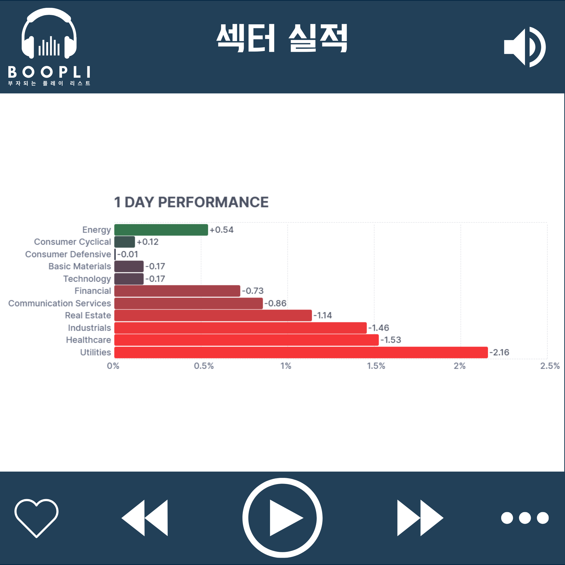일본은행(BOJ)의 금리 인상 시사로 미 국채 금리도 동반 상승하자 금리에 민감한 유틸리티 섹터가 하락 주도, 이어서 헬스케어, 산업재, 부동산, 커뮤니케이션 서비스, 금융 순으로 약세