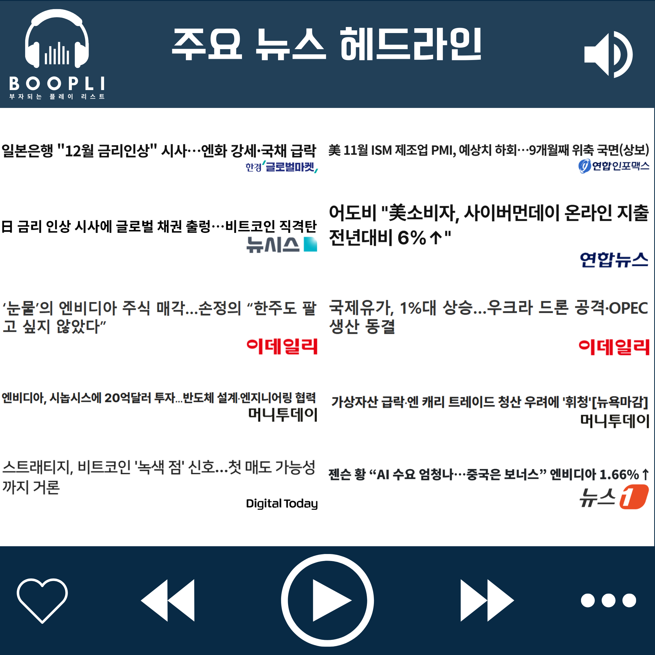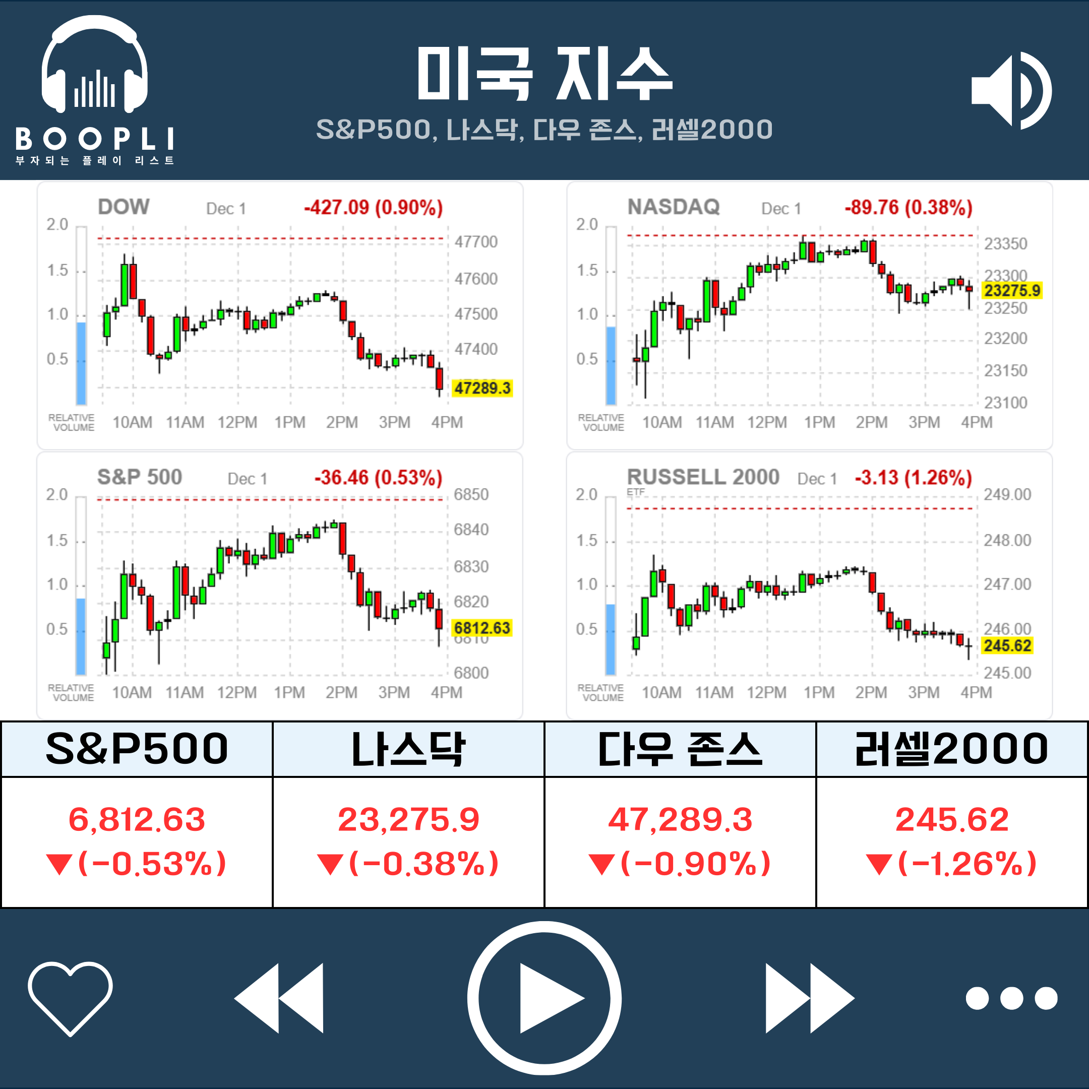 장중에는 11월 ISM 제조업 PMI가 48.2로 예상치(49.0)를 하회하며 제조업 경기 위축이 지속되었으나, 시장 영향은 제한적