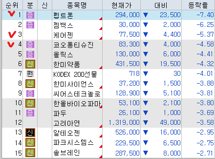 반면, 최근 강세를 보였던 바이오 섹터에서 차익실현 매물이 출회되며 하락