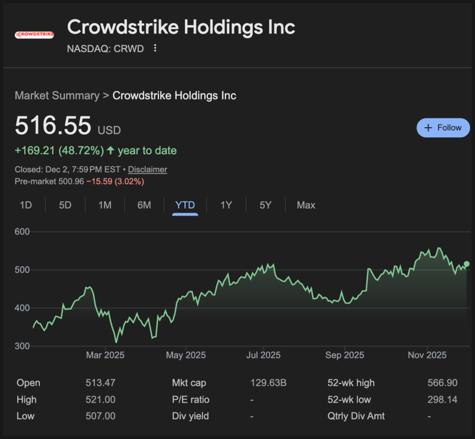 먼저 사이버 보안 대장주 크라우드스트라이크(CrowdStrike)는 실적 아웃퍼폼과 가이던스 상향까지 이뤄냈으나 주가는 장 마감 후에 오히려 하락했습니다.