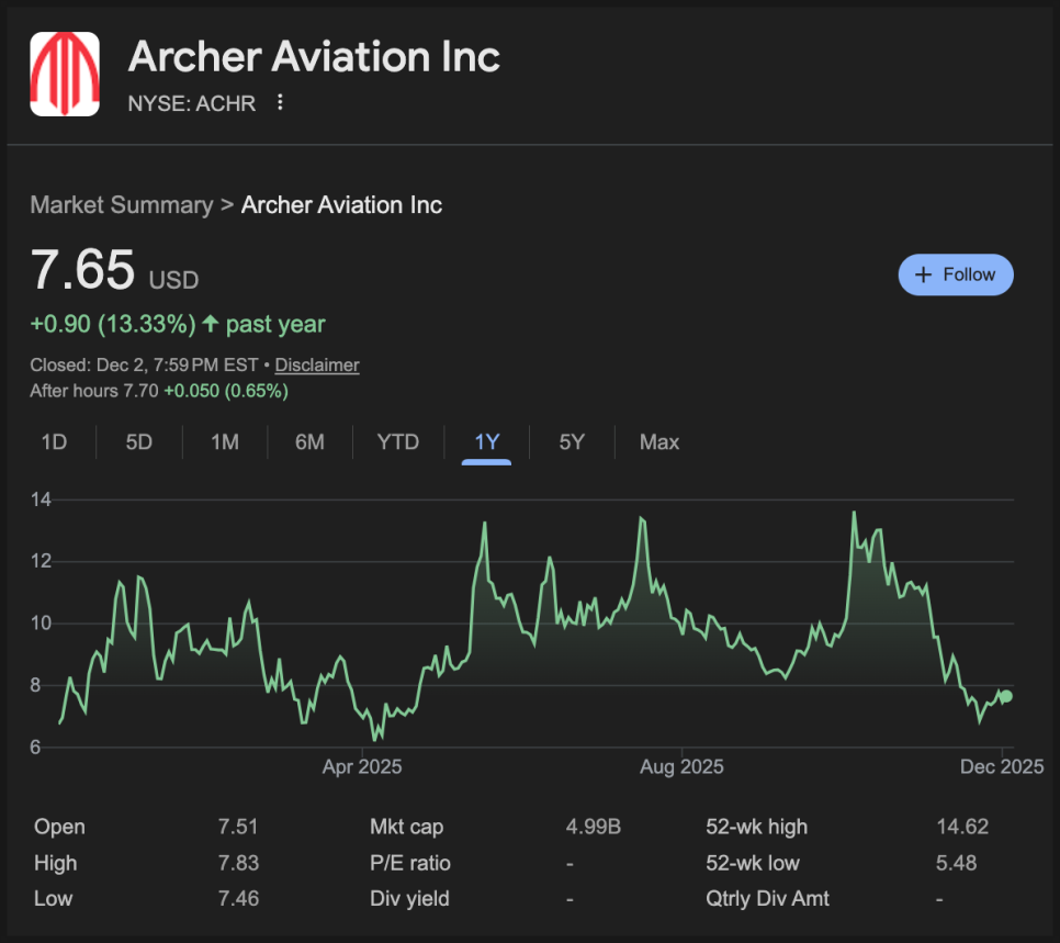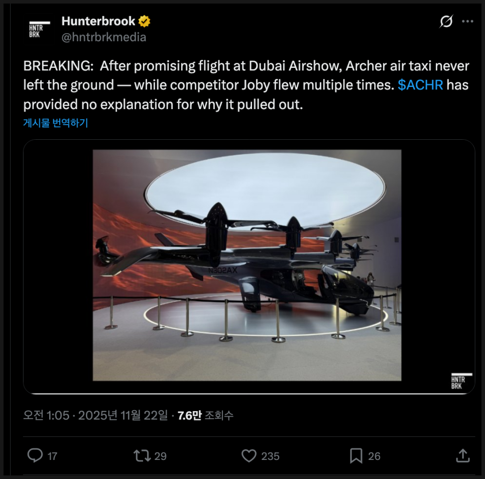 한편 지난달에 헌터브룩 캐피털(Hunterbrook Capital)이라는 곳에서 아처에 대해 공매도 포지션을 공개하기도 했는데요. 헌터브룩은 아처의 대표 모델인 미드나이트(Midnight) 전기 에어택시가 2025 두바이 에어쇼에서 한 번도 실제로 날지 않았기 때문이라고 주장을 했습니다.