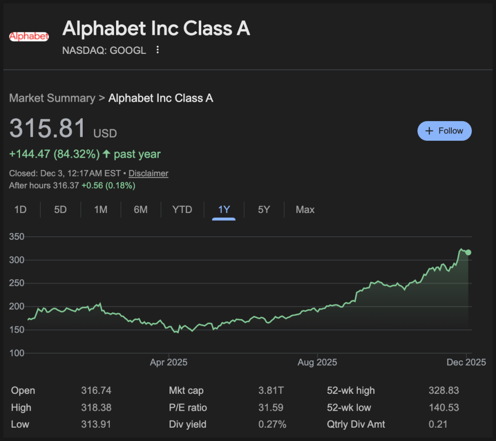 챗지피티가 처음 나왔을 때만 해도 구글이 망했다는 소리가 나왔고, 구글 CEO가 코드 레드를 발령했었는데 이제는 오픈AI가 급해진 입장이 된 거죠. 그만큼 기술 시장은 매우 빠르게 급변하고 있습니다. 구글 주가 분위기는 매우 좋은 상태이며, 지난 1년 간 80% 이상 올랐습니다.