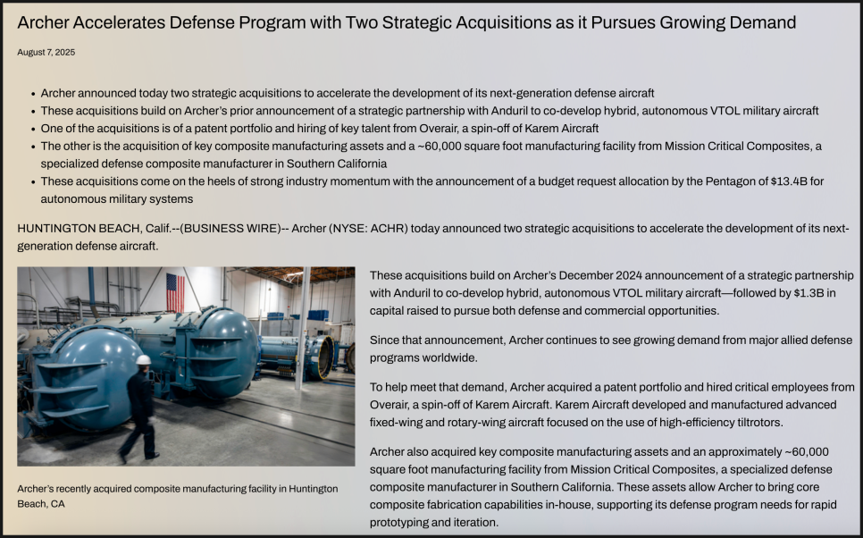 아처가 군사용 항공기에 관심을 보인 건 이번이 처음이 아닙니다. 2024년 말에는 방위산업 스타트업인 앤듀릴(Anduril)과 손잡으면서 군용 개발 계획을 처음 공개했고, 올해 들어서는 관련 기술을 빨리 확보하기 위해 인수도 여러 번 했습니다.
