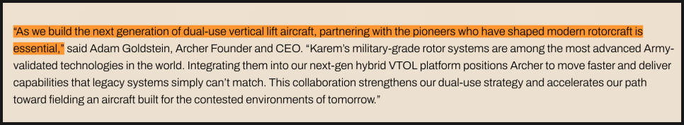 아처의 CEO인 애덤 골드스타인은 카렘 기술을 “미군이 실제로 검증한 최고 수준의 회전날개 기술”이라고 표현했습니다. 그리고 이 기술이 들어가면 기존의 헬기나 틸트로터보다 훨씬 빠르고 조용한 차세대 항공기를 만들 수 있다고 강조했죠.