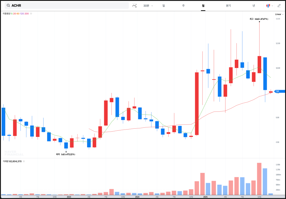 마지막으로 아처 에비에이션 차트를 보겠습니다. ACHR은 지난 1년 반 동안 강한 상승과 깊은 조정이 반복된 종목입니다.