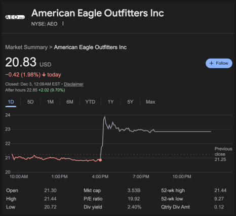 아메리칸 이글(American Eagle)은 장중에는 2퍼센트 빠졌지만, 장후 거래에서는 오르기 시작했습니다. 3분기 실적이 예상보다 좋았고, 4분기 연말 쇼핑 시즌 전망도 올렸기 때문입니다. 3분기 EPS는 0.53달러를 기록했고, 4분기에는 기존 매장 매출이 8~9퍼센트 성장할 것으로 보인다고 밝혔습니다.