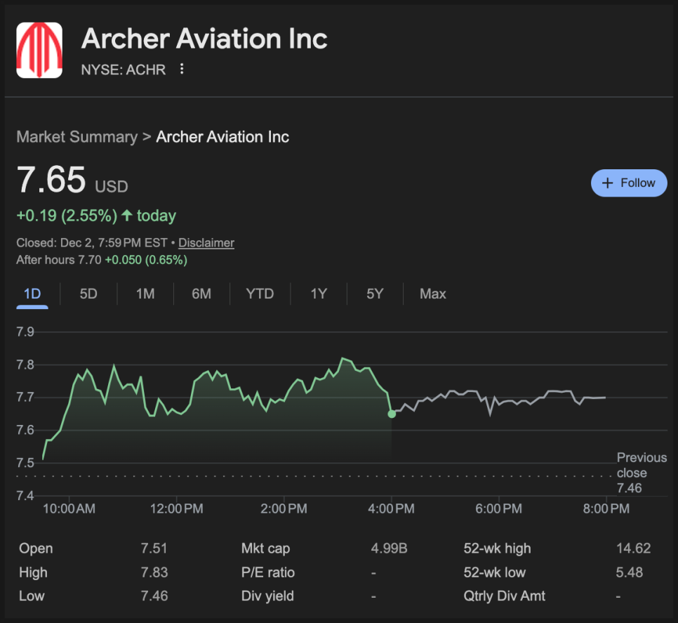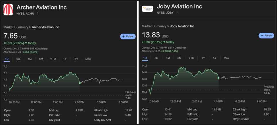 이날 아처(ACHR) 주가는 상승했습니다만 큰 반향을 불러오지는 못했는데요. 라이벌 기업인 조비(JOBY) 주가도 비슷하게 올랐다는 점에서 투자자들이 크게 반응을 한 것 같지는 않습니다.