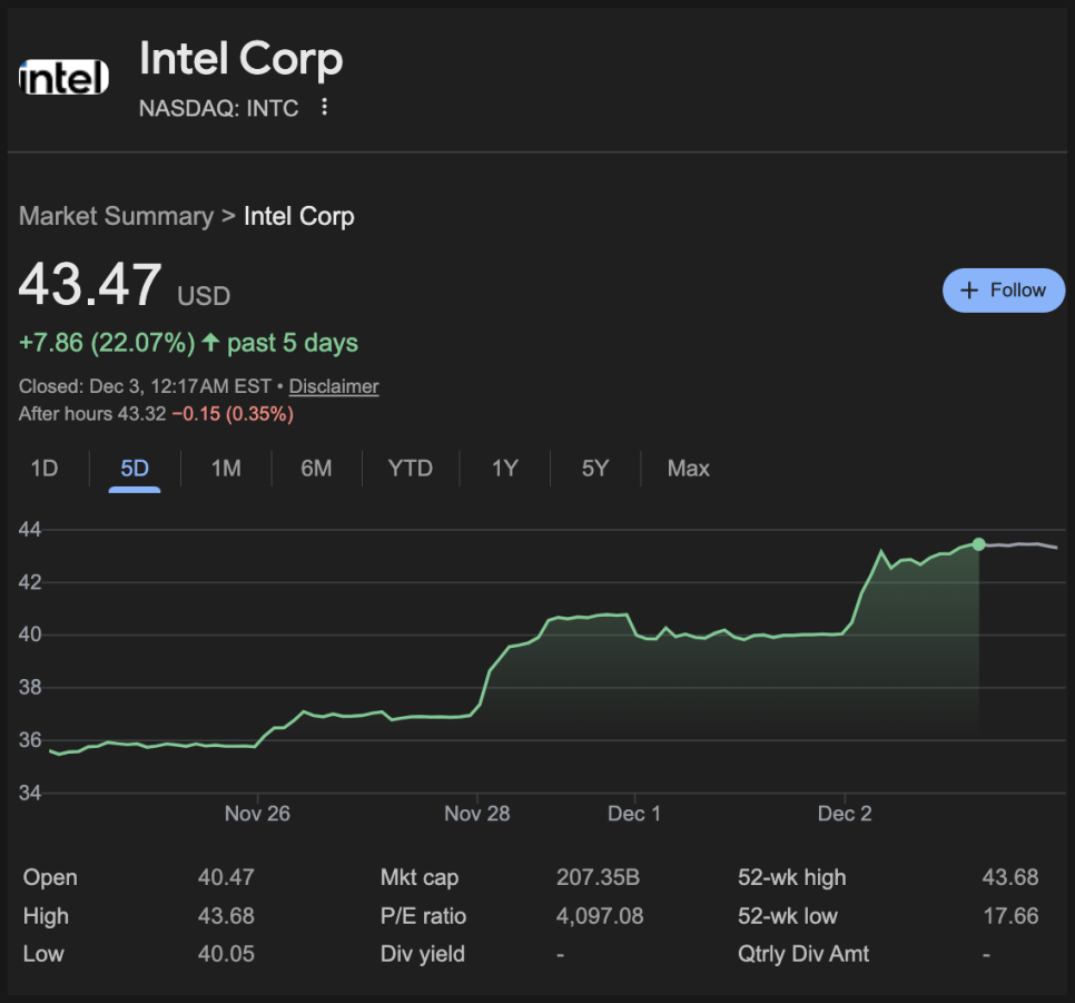 덕분에 인텔 주가 흐름도 좋은데, 이날 주가는 8% 올랐고 지난 일주일 간 22% 올랐습니다.