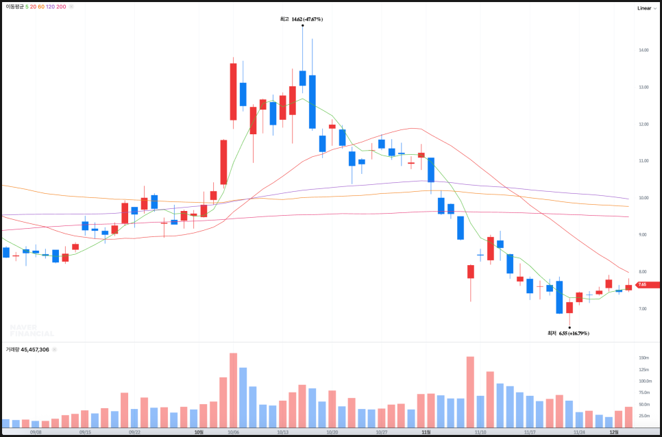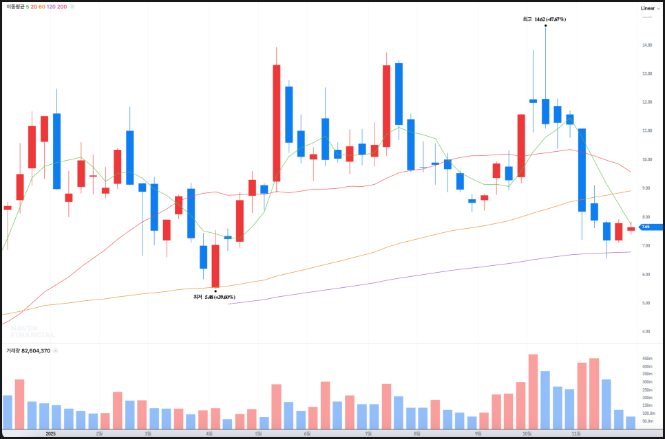 그 뒤로는 계속 짧은 반등과 다시 하락을 반복하면서 바닥을 다지는 흐름에 머물러 있는데요. 최근 며칠은 7달러 중반에서 거래량이 줄어든 채 작은 캔들만 나오고 있어서, 매도 압력은 다소 줄었지만 뚜렷한 매수세도 없는 ‘관망 구간’이라고 볼 수 있습니다.