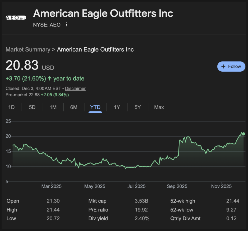 아메리칸 이글은 시드니 스위니와 트래비스 켈시를 내세운 광고로 꽤나 큰 재미를 봤는데, 최근 다시 마사 스튜어트 같은 클래식한 이미지의 광고로 방향을 틀었고 이게 긍정적으로 작용했다는 평가도 있습니다. 브랜드 전략이 다시 맞아떨어지는 분위기죠.