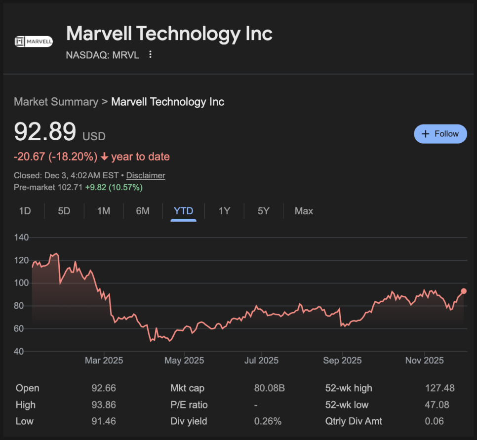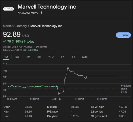 반면 마벨 테크놀로지(Marvell Technology)는 장후에 10퍼센트 이상 급등했습니다. 매출 20억 7천만 달러, EPS 2.20달러를 기록하며 예상치를 크게 상회했고, 무엇보다 데이터센터 매출이 15억 달러 이상으로 크게 증가한 점이 강하게 반영됐습니다.