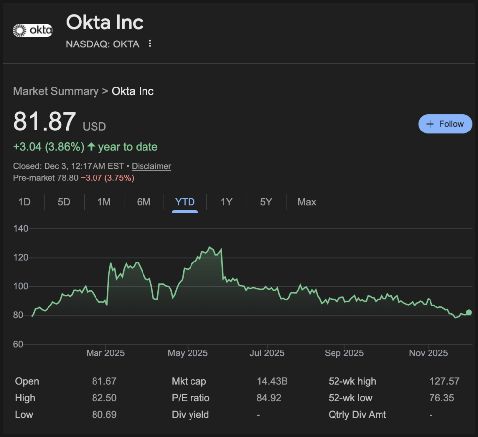 또 다른 사이버 보안 기업 옥타(Okta)도 비슷한 반응이었습니다. 실적은 시장 기대를 넘겼고 다음 분기 전망도 좋았는데, 장후에는 빠졌습니다.