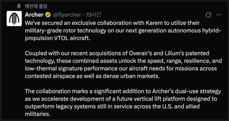 첫 번째 소식입니다. 미국의 항공기 개발 회사인 아처가 카렘 에어크래프트(Karem Aircraft)와 독점 협업을 발표하면서 주가가 3퍼센트 올랐습니다. 이번 협업의 핵심은 카렘이 갖고 있는 군사용 기술을 그대로 가져올 수 있게 됐다는 점인데요.