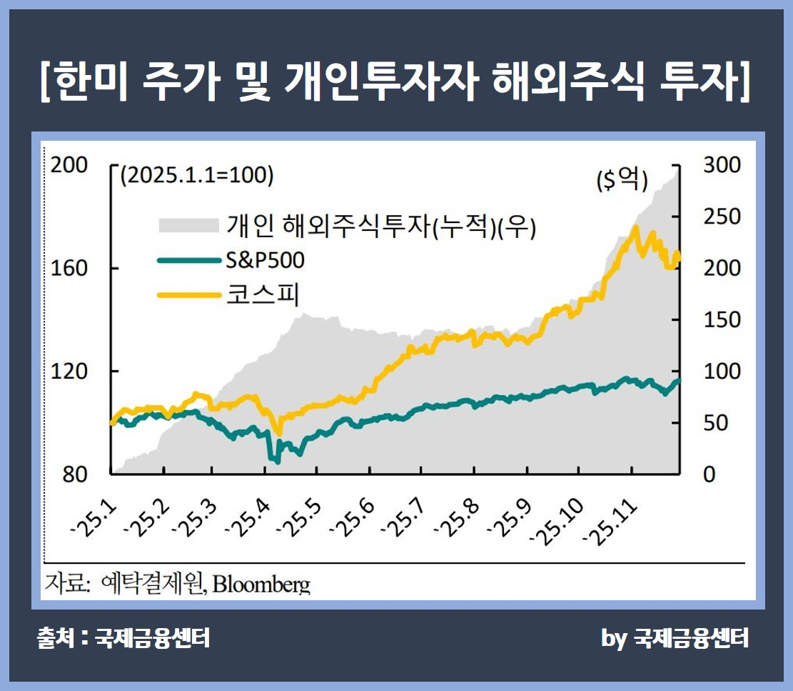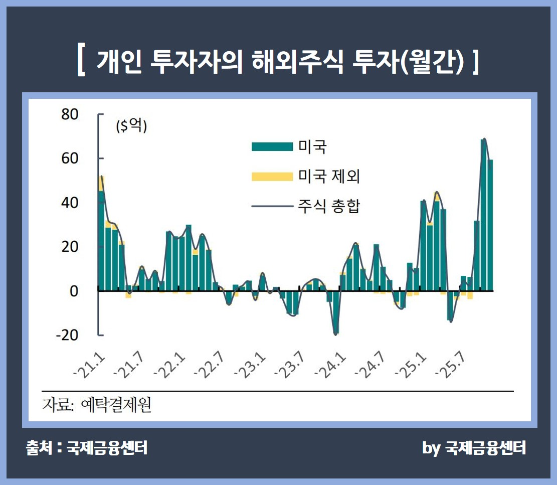 ● 미국 AI 버블 경계감 등으로 변동성이 높아졌음에도 불구하고 대규모 해외주식 매수세가 지속(UBS AI 주가지수 -6.6%)