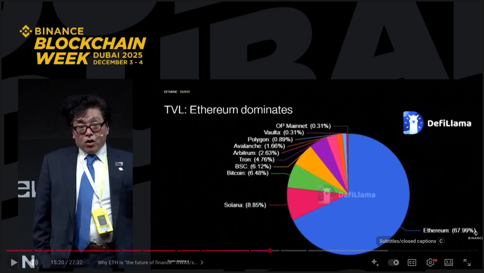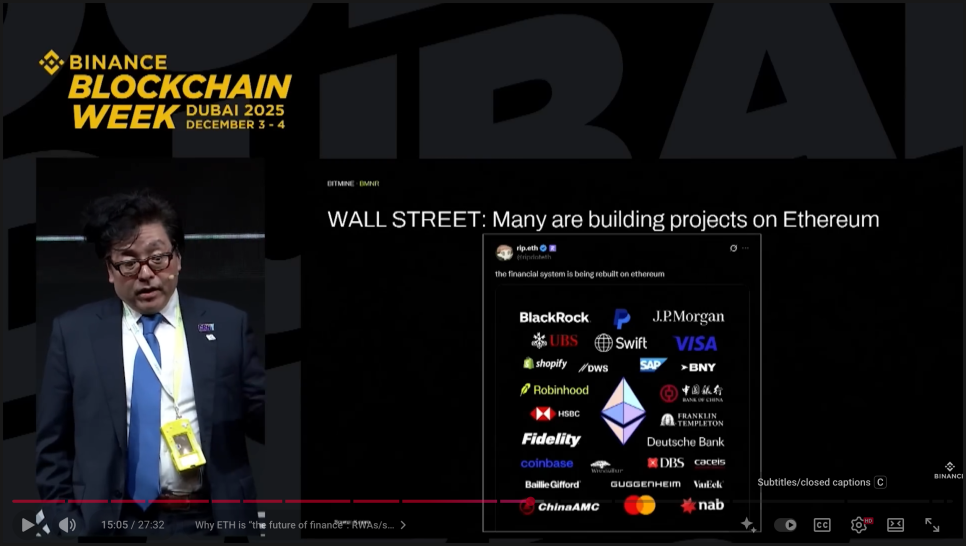이중 오늘 컨텐츠로 다룰 것은 바로 이튿날 톰 리의 연설인데요. 지금의 코인 가격 조정이 시장의 구조적 변화와 동떨어져있다면서, 토큰화와 이더리움 생태계 확장을 중심으로 한 금융 시스템의 재편이 이미 시작됐다는 점을 강조했습니다. 또 전통 금융과 블록체인이 연결되는 과정이 얼마나 빠르게 진행되고 있는지, 그리고 왜 이더리움이 그 중심에 서 있는지를 설명했습니다.