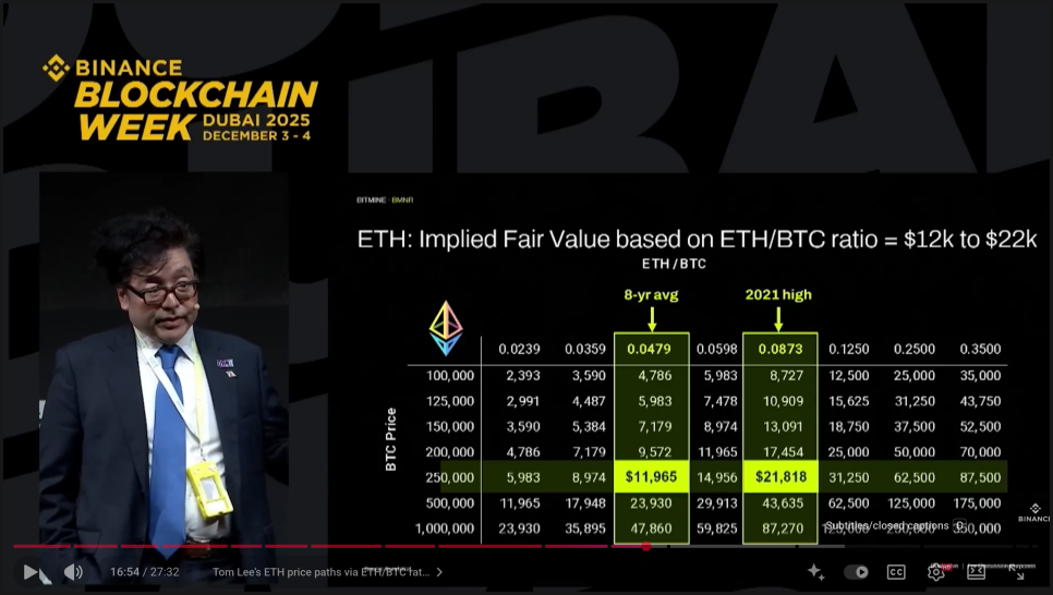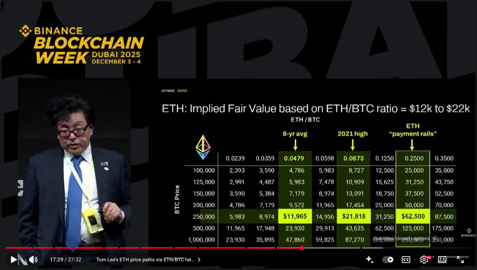 마지막으로 톰 리는 장기적인 시나리오를 제시합니다. 이더리움이 단순한 투자자산을 넘어 토큰화 시대의 핵심 결제 인프라로 자리 잡는 순간, ETH/BTC 비율은 더 높은 수준으로 이동할 가능성이 크다고 설명합니다. 그는 이 비율이 0.25까지 올라갈 수 있다고 보고, 그렇게 되면 이더리움 가격은 6만 달러 이상을 향하게 된다고 말합니다. 정확하게는 6만 2천 달러라는 가격을 언급했죠.