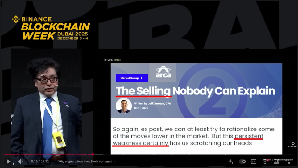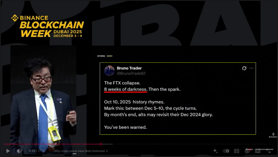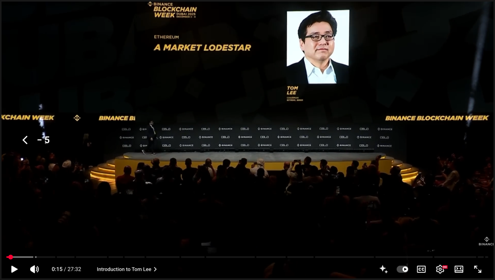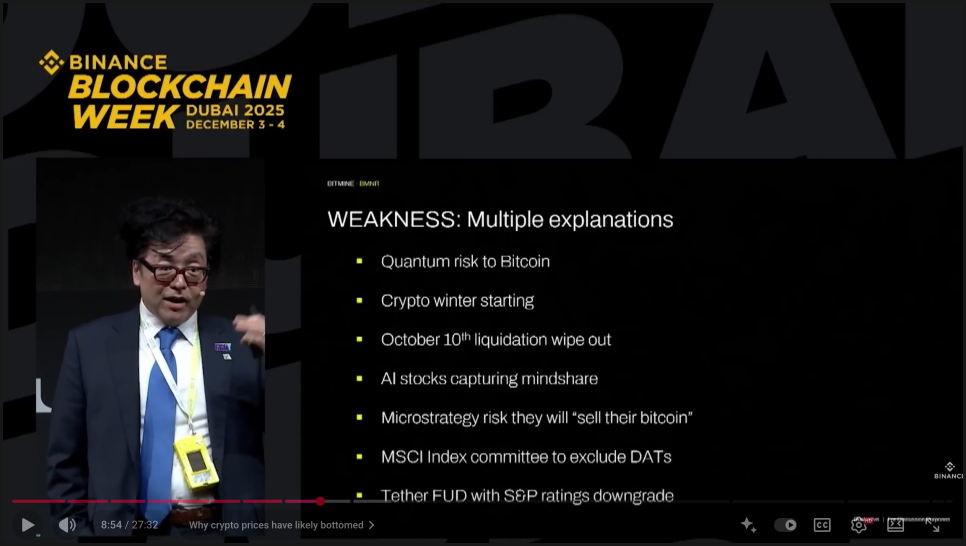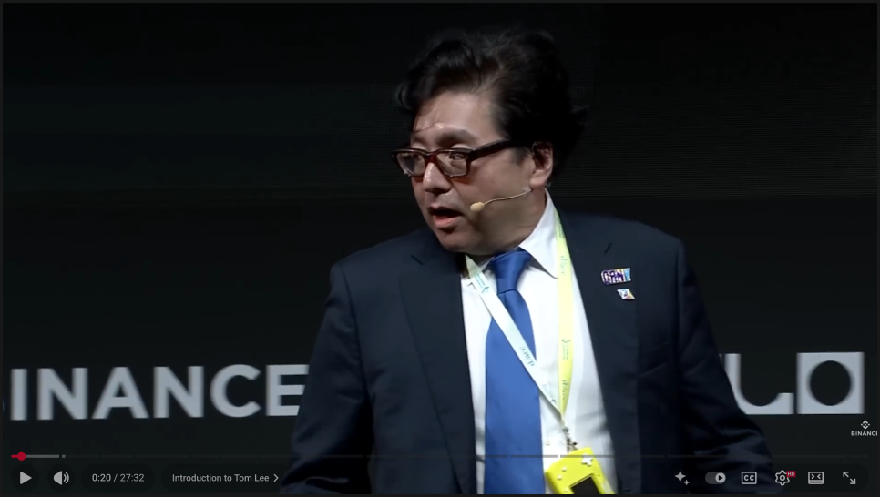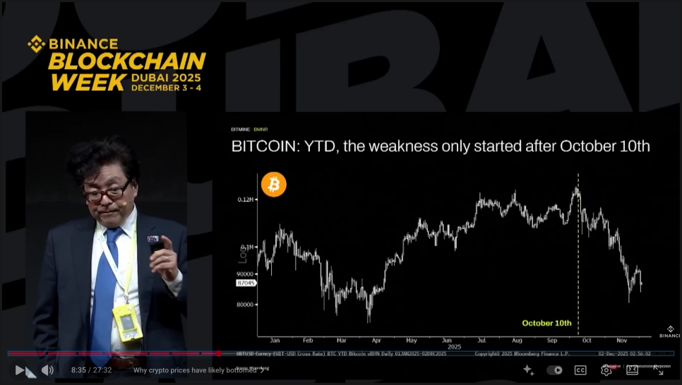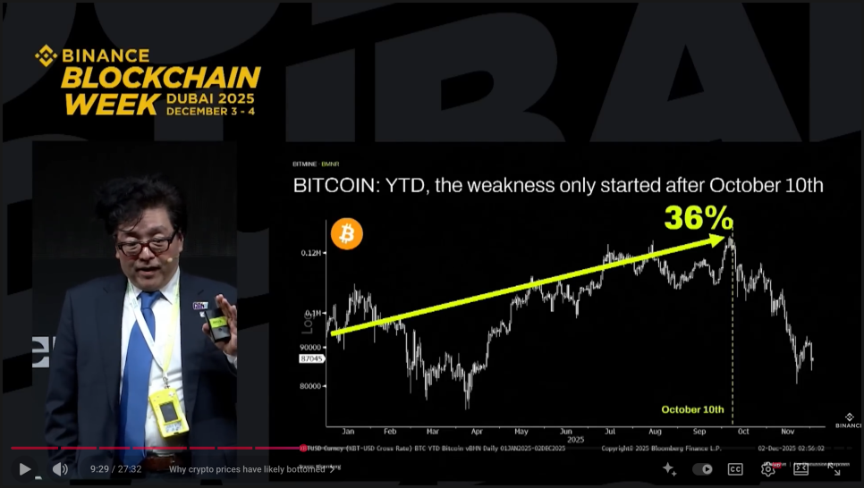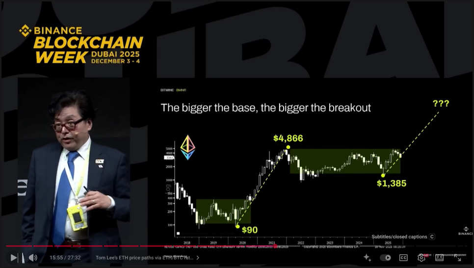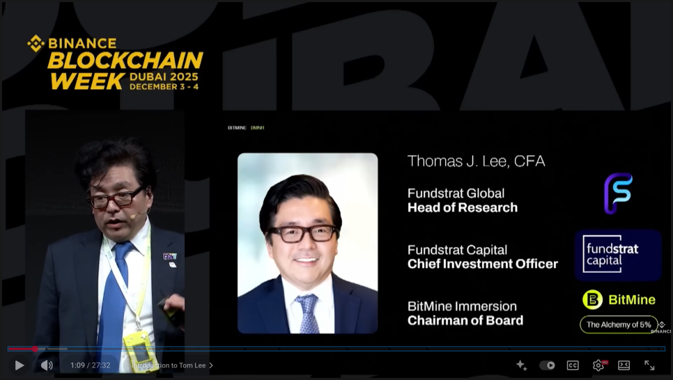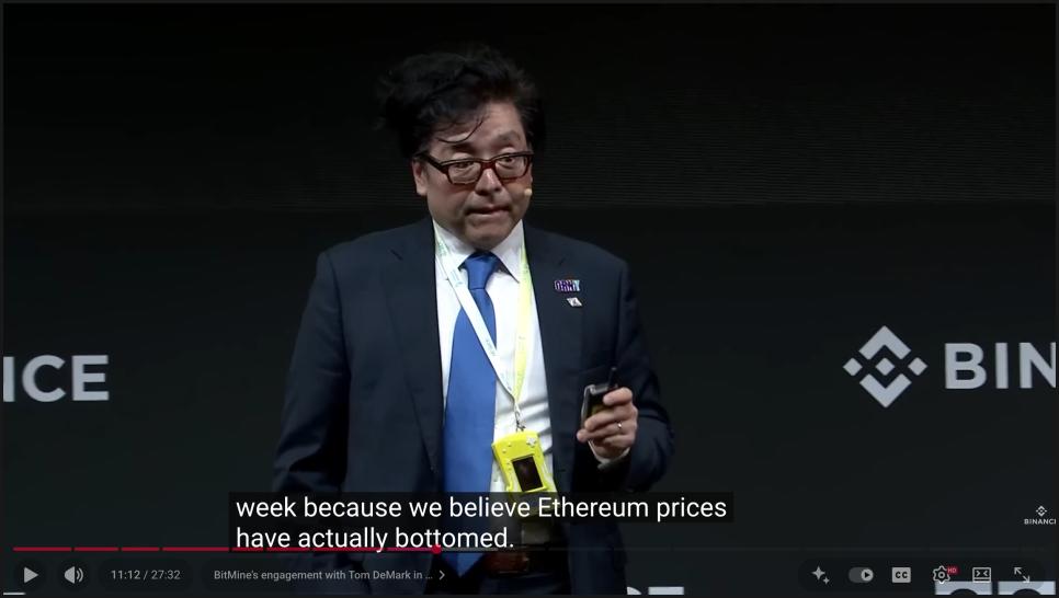 먼저 톰 리는 강연을 시작하면서 최근 몇 달 동안 시장 분위기가 많이 흔들렸다는 점을 짚었습니다. 10월 이후로 가격이 가파르게 밀렸고, 낙관론 대신 피곤함과 실망이 커진 시기였죠. 많은 사람이 포기 직전까지 왔다고 말하는 상황에서, 그는 오히려 이런 순간이 암호화폐를 다시 바라볼 타이밍이라고 이야기합니다. 특히 이더리움에 대해 여전히 강한 확신을 갖고 있다고 강조했죠.