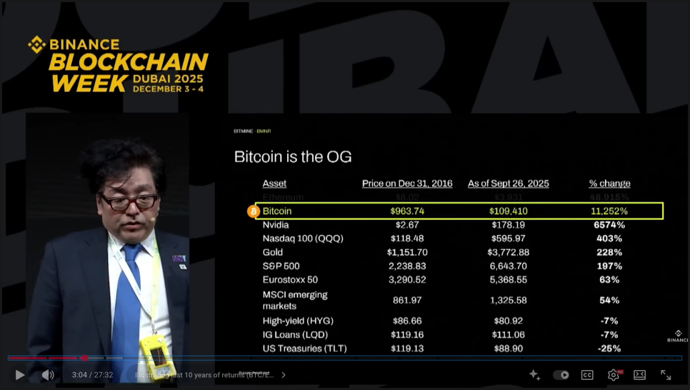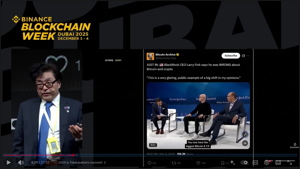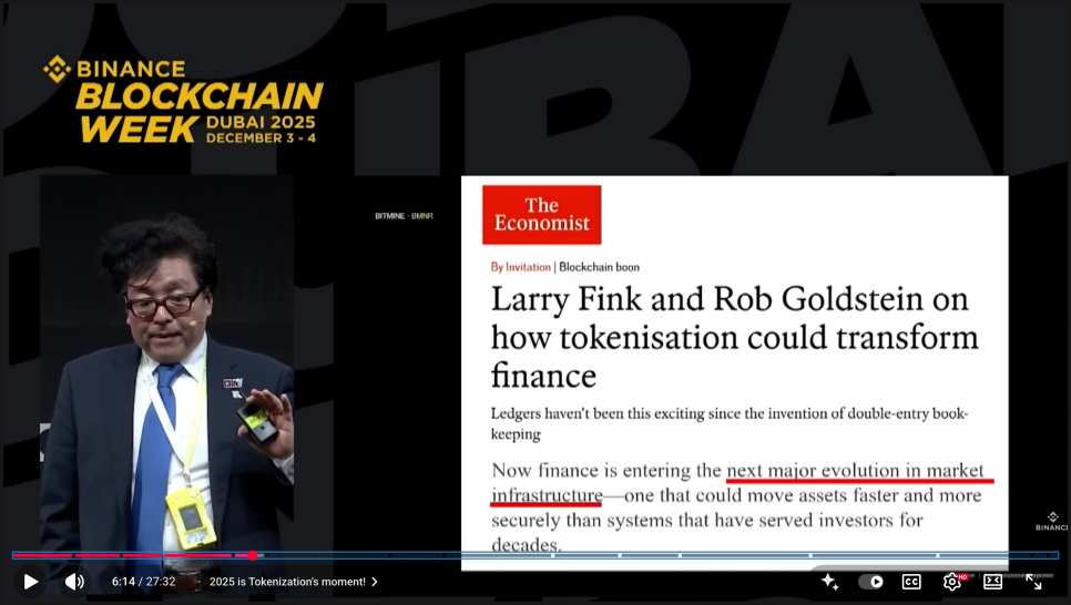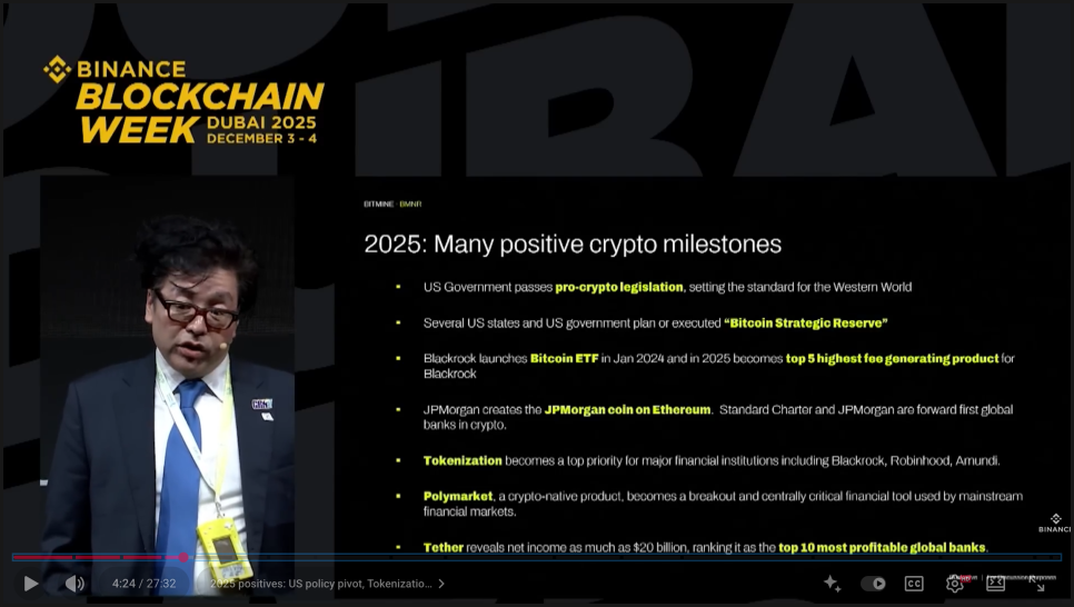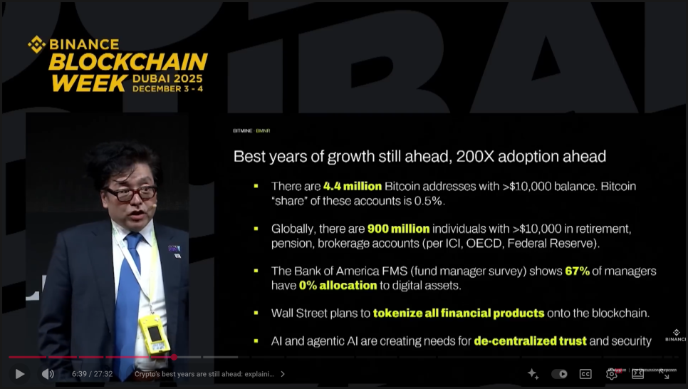 엄밀히 말하면 지난 비트마인 11월 의장 메시지에서 다뤘던 내용을 재활용한 것이라 볼 수 있는데, 아무래도 이번엔 유튜브 채널이 아니라 실제 청중 앞에서 연설을 해서 조금 더 이해하기 쉽고 자세하게 본인의 관점을 제시했습니다.