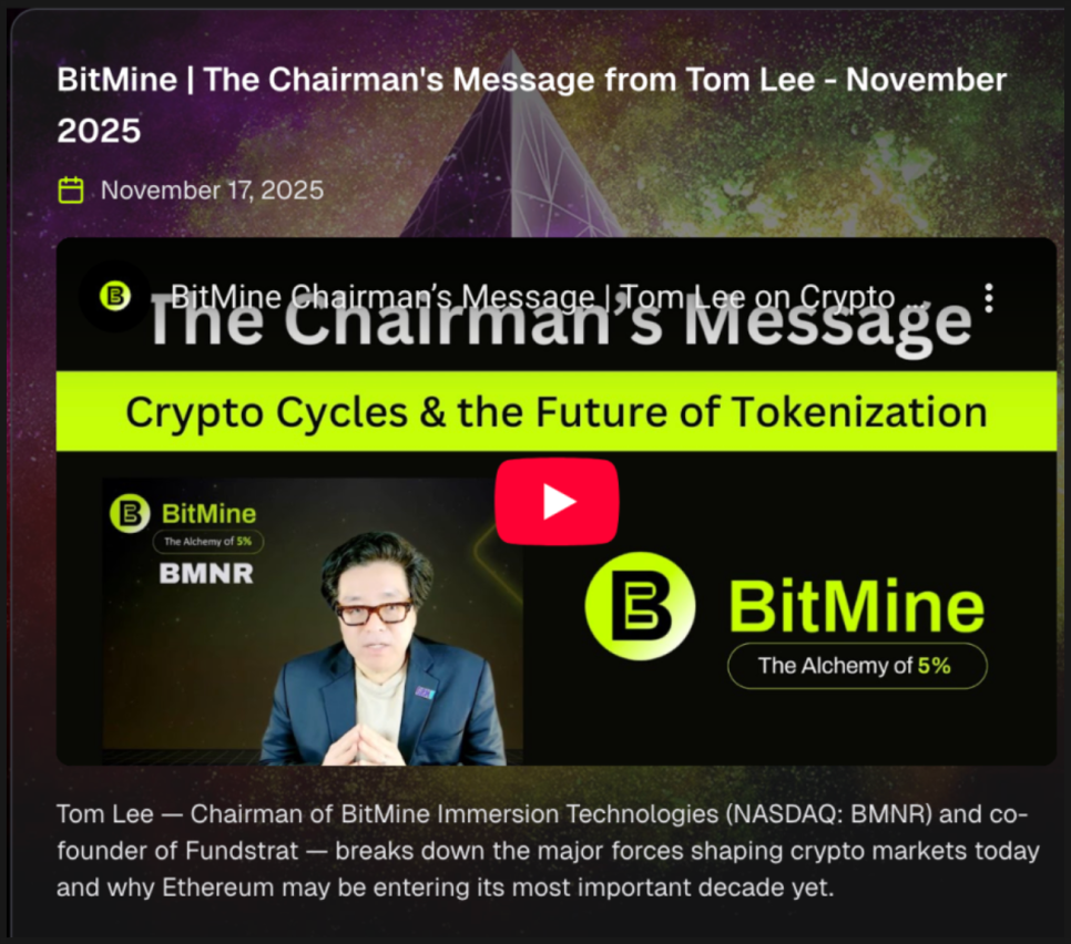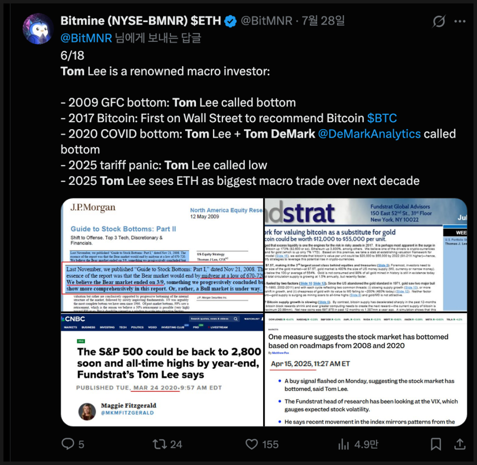 거기다가 비트마인이 실제 자금을 투입하는 기관이 행동으로 확신을 보여줬음을 강조한 게 흥미롭습니다. 내부 판단이 전략으로 이미 반영되고 있음을 공개적으로 드러낸 거죠.