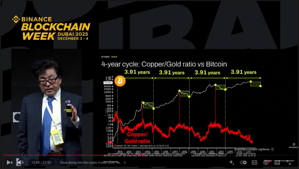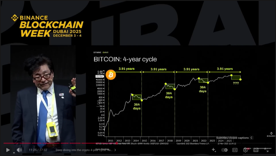 톰 리는 여기서 투자자들이 아직 많이들 믿고 있는 ‘비트코인 4년 주기’에 대해 한 번 더 생각해보자고 말합니다.