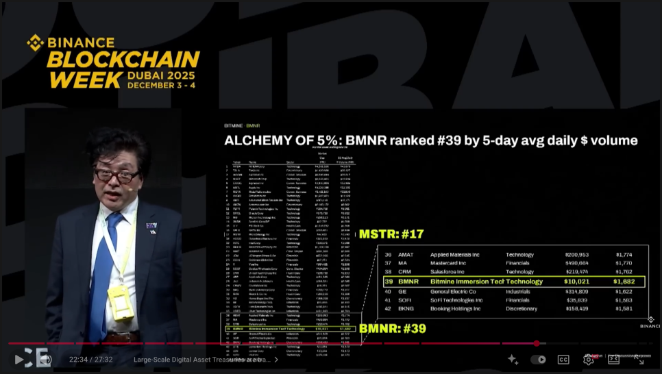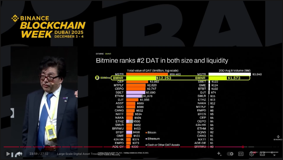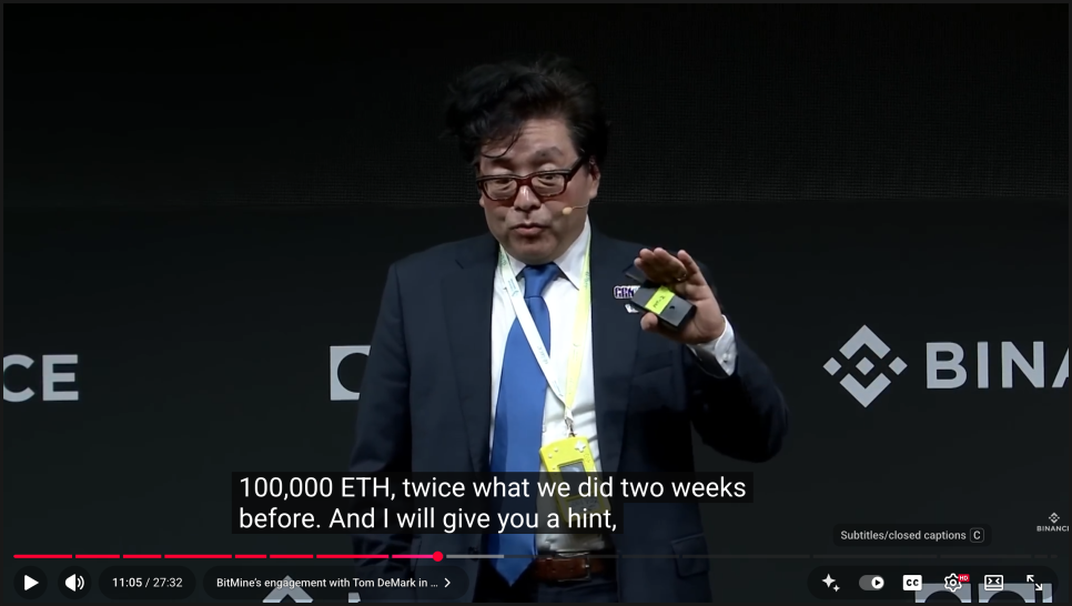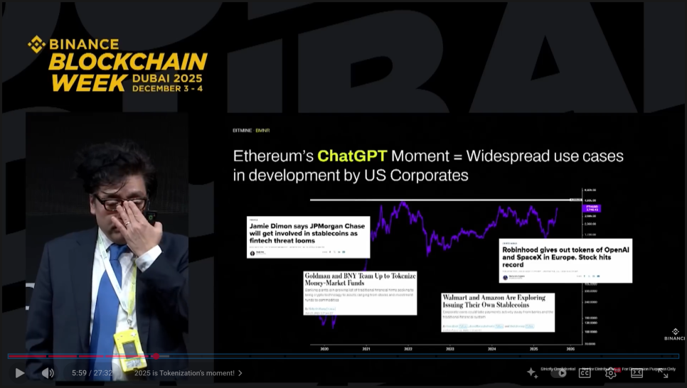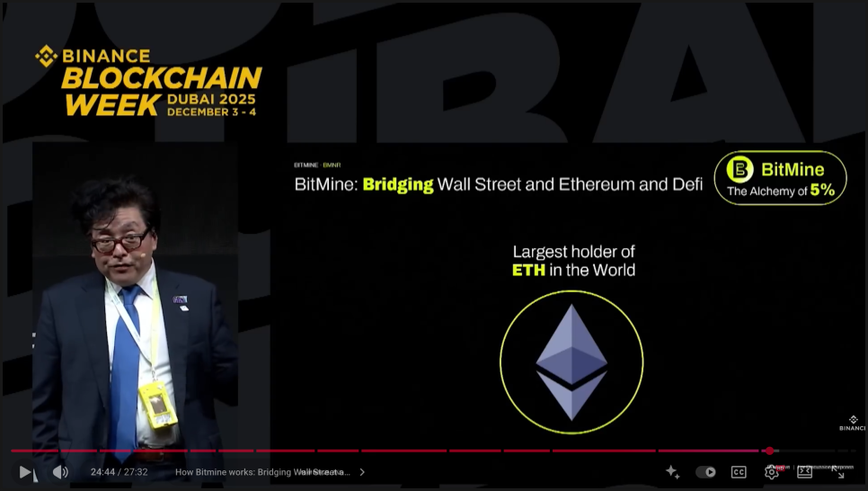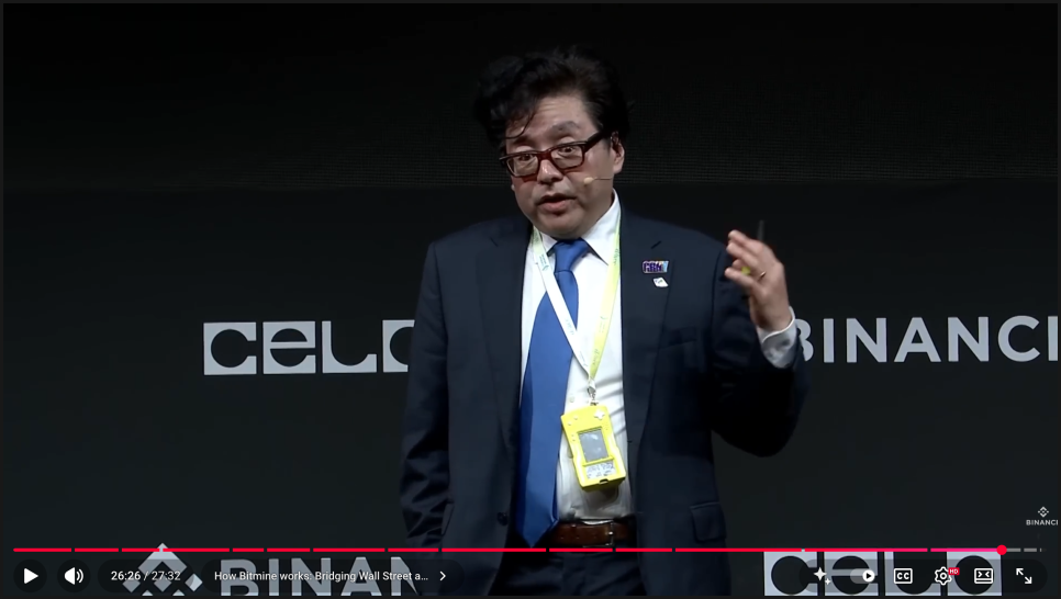 이 시점에서 톰 리는 자신이 회장으로 있는 비트마인 이머션 이야기를 본격적으로 하기 시작했습니다. 톰 리는 비트마인이 단순히 이더리움을 보유한 회사가 아니라, 월가와 이더리움 생태계를 잇는 새로운 형태의 금융 인프라 기업이라고 강조합니다.