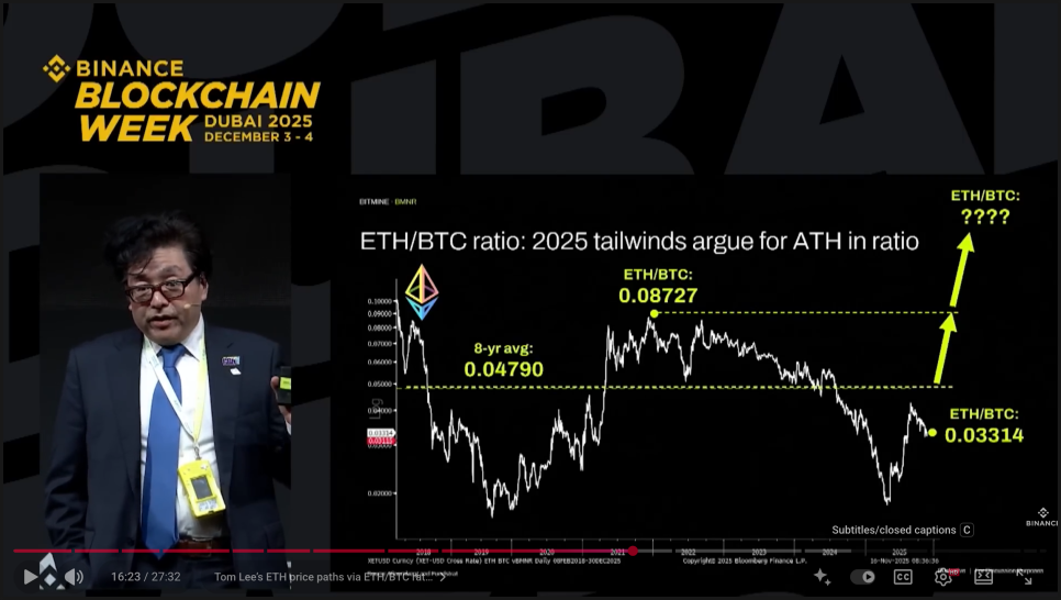 톰 리는 이 시점에서 이더리움의 잠재적 가격 전망을 좀 더 구체적으로 설명합니다. 무작정 “오를 것 같다”는 식의 전망이 아니라, 비트코인 대비 이더리움의 상대 가치를 보여주는 ETH/BTC 비율을 기반으로 논리를 펼치는데요. 이 비율은 두 자산이 시장에서 어떤 역할을 맡고 있는지, 그리고 기관 투자자들이 자금을 어떻게 배분하는지를 가장 잘 보여주는 지표이기 때문에 의미가 있죠.