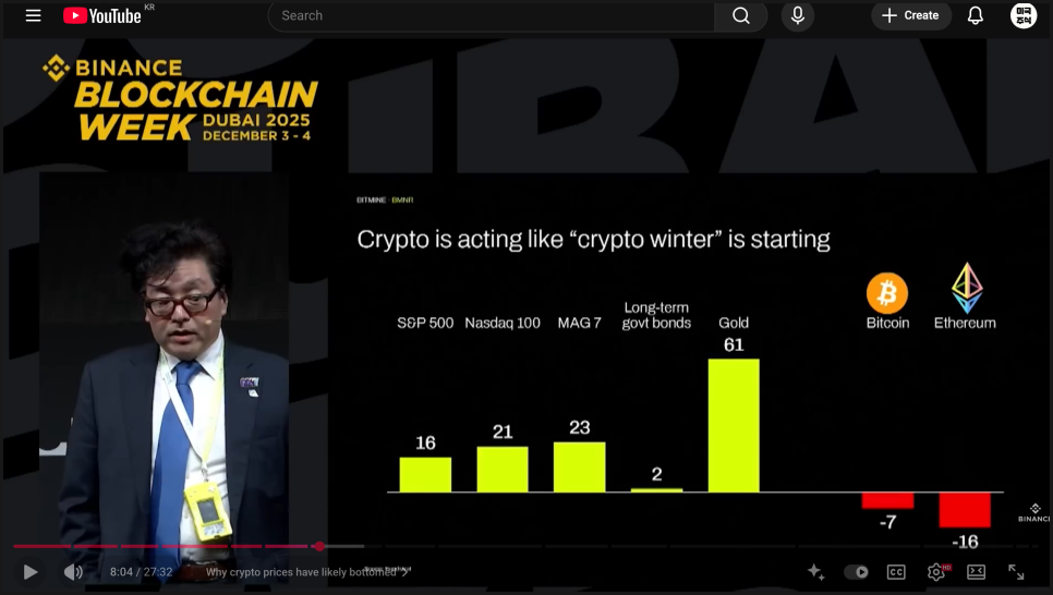 여기서 톰 리는 크립토 겨울 이야기를 꺼냅니다. 올해 글로벌 자산의 흐름을 보면 주식 시장, 빅테크, 금 가격 다 올랐는데 코인은 오히려 떨어졌다는 거죠.