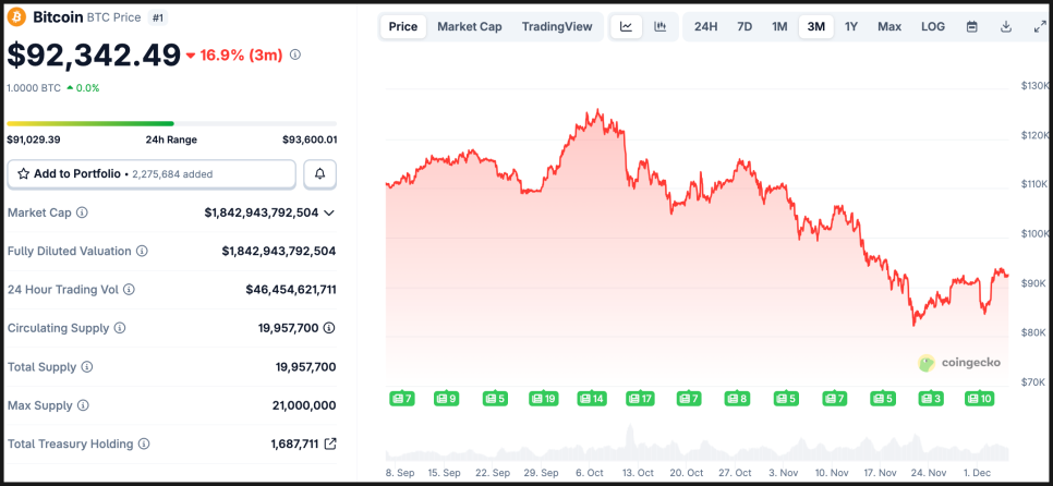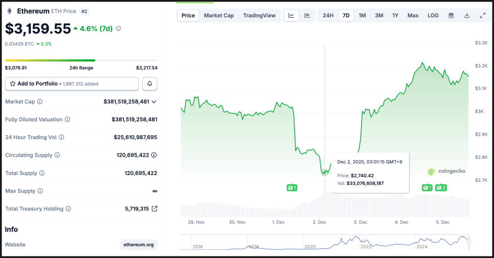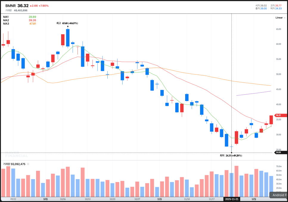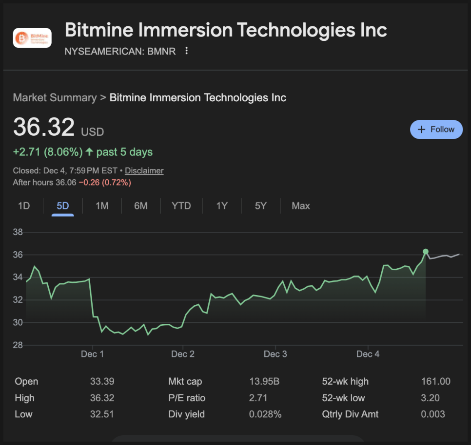 한편 12월 5일 비트마인 이머션(BMNR) 주가는 약 8% 급등했습니다. 12월 초 저점 대비 3연속 거래일 오르고 있습니다.