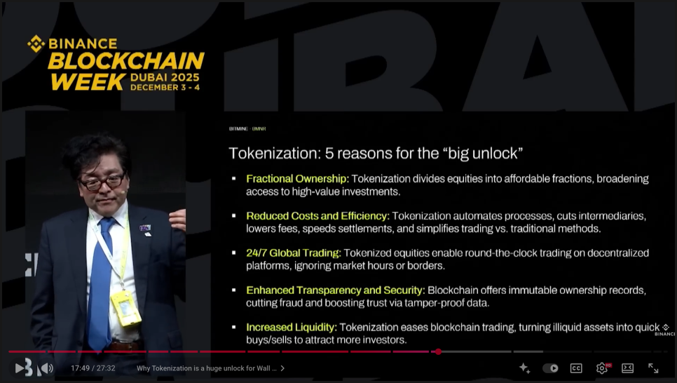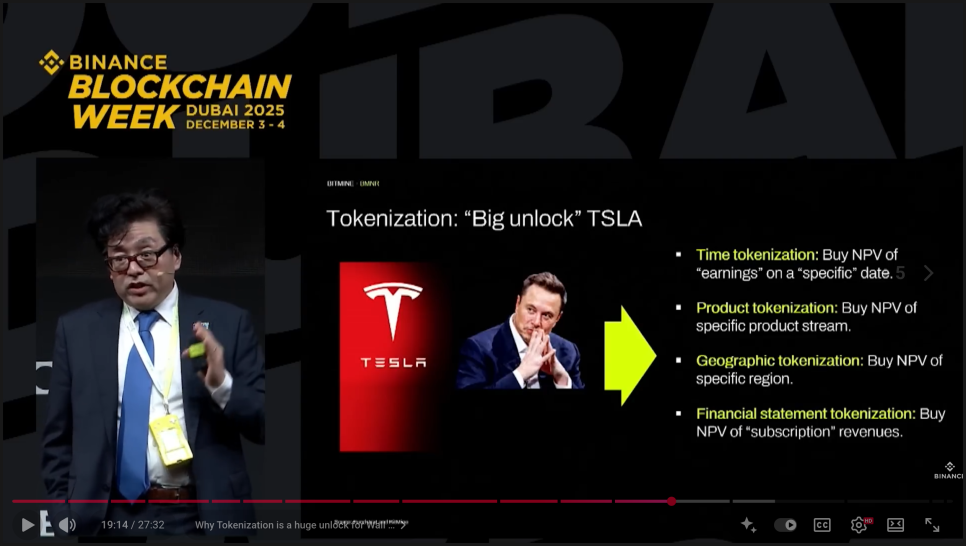 그 다음으로 톰 리는 이 시점에서 토큰화가 왜 현대 금융 시스템을 아예 새로 짜는 변화인지 설명하는데요. 비트마인이 공개한 11월 회장 메시지에서 강조됐던 것처럼, 토큰화의 핵심은 종이나 전산 기록을 블록체인으로 옮기는 수준이 아니라, 금융상품을 구성하는 요소 자체를 다시 쪼개고 재설계할 수 있다는 데 있습니다. 기업 전체 가치가 아니라 특정 연도의 순이익, 특정 제품 라인의 현금흐름, 특정 지역 매출처럼 훨씬 세밀한 요소를 개별적으로 사고팔 수 있게 만드는 구조죠.