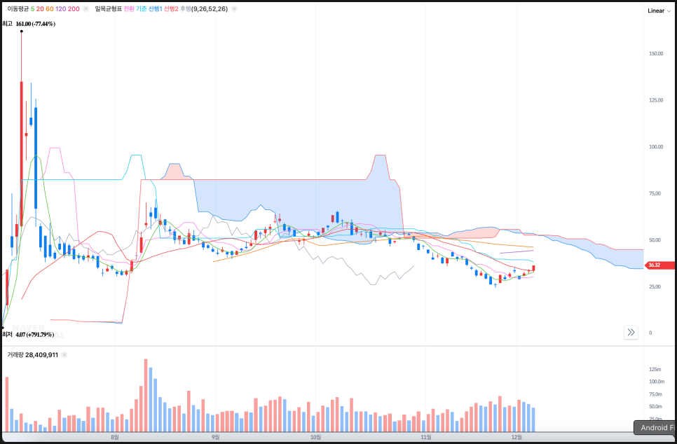 현재로서 바닥은 지난 11월 21일에 찍었던 24.33 달러입니다. 그때 대비 50% 오른 상태네요. 5일선이 20일선과 만나는 지점에서 양봉이 나와주면서 20일선 위로 올라갔고, 만일 이 흐름이 지속된다면 5일선 역시 20일 선 위로 치고 올라갈 수 있겠습니다.