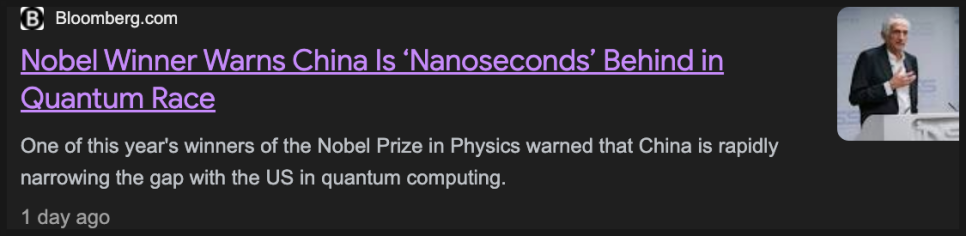 마지막으로 양자컴퓨터 섹터 투자자들이 관심 있어 할 만한 소식입니다. 최근 노벨 물리학상 수상자인 존 마티니스(John Martinis)가 블룸버그 인터뷰에서 “중국이 양자 분야에서 미국을 거의 따라잡았다”고 경고했습니다. 양자 기술 격차가 예전에는 몇 년 단위로 벌어져 있다면, 지금은 “나노초 수준”으로 차이가 줄어들었다는 표현까지 썼습니다. 마티니스는 구글이 양자 우월성을 달성했을 때 기준으로 중국이 약 3년 정도 뒤처져 있다고 판단했지만, 이후 중국의 논문과 연구 결과를 볼 때 따라오는 속도가 매우 빠르다고 말했습니다.