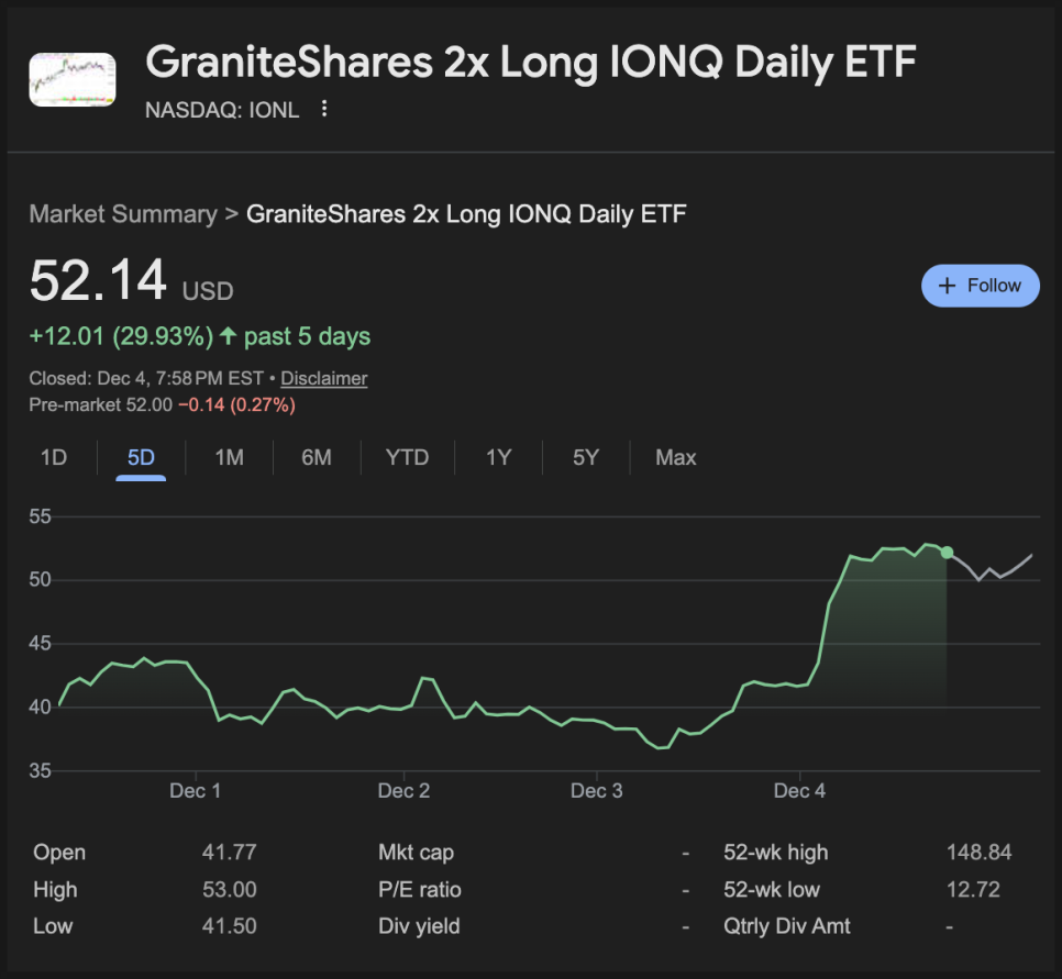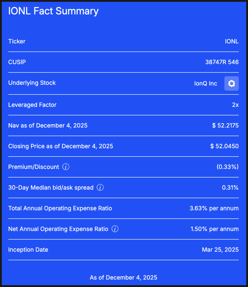 GraniteShares가 운용하는 IONL이라는 2배 레버리지 일일 ETF 같은 경우 실제로 강한 모습을 보이고 있습니다.