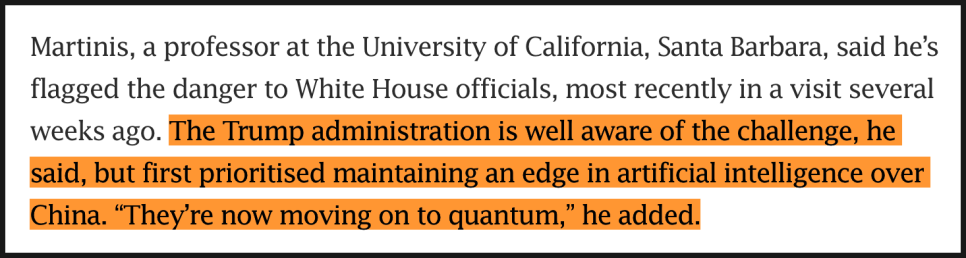 마티니스 박사는 미국 정부에도 몇 차례 이런 위험을 직접 전달했다고 밝혔습니다. 현재 트럼프 행정부는 인공지능 우위를 지키는 데 더 많은 자원을 투입해 왔지만, 이제는 양자 분야로 관심을 넓히고 있다고 설명했습니다. 마티니스는 중국 연구진이 서구에서 새로운 양자 성과가 발표되면 몇 달 안에 비슷한 성과를 직접 재현한다는 점을 강조하며 경쟁 구도가 상당히 빠르게 움직이고 있다고 말했습니다.