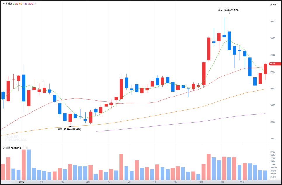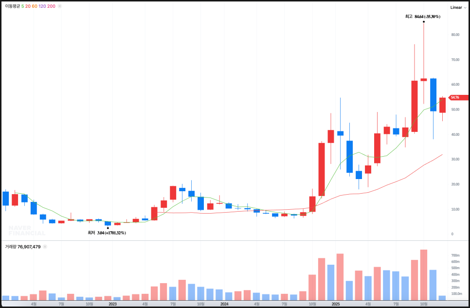 먼저 월봉 먼저 볼까요? 지난 2년간의 긴 침체가 2025년 중반부터 본격적인 상승으로 전환된 모습입니다. 3달러대 저점에서 꾸준히 거래량이 유입되기 시작했고, 이후 대형 호재들이 겹치면서 최고 84.64달러까지 상승했습니다. 월봉 기준으로 보면 지금은 큰 상승 이후 자연스러운 눌림 단계인데, 장기 추세 자체는 여전히 상승 흐름을 유지하고 있습니다. 거래량도 이전과 비교하면 완전히 다른 수준으로 올라왔기 때문에 시장 참여층이 넓어진 점이 특징입니다.