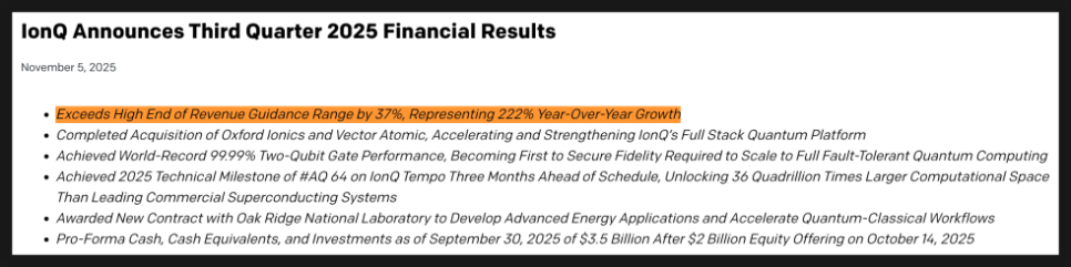 말 나온 김에 지난 11월 5일에 있었던 실적 발표를 짧게 되짚고 가겠습니다. 아이온큐는 그때 전년 대비 222% 성장한 3,990만 달러의 매출을 발표하며 가이던스 상단을 크게 넘어섰습니다. 여기에 옥스퍼드 아이오닉스와 벡터 아토믹 인수를 마무리하면서, ‘양자 플랫폼’ 기업으로 도약하겠다는 전략을 더욱 구체화했죠. CEO 니콜로 드 마시는 “양자 시대는 미래가 아니라 지금이다”라는 메시지를 던질 만큼 강한 자신감을 드러냈습니다.