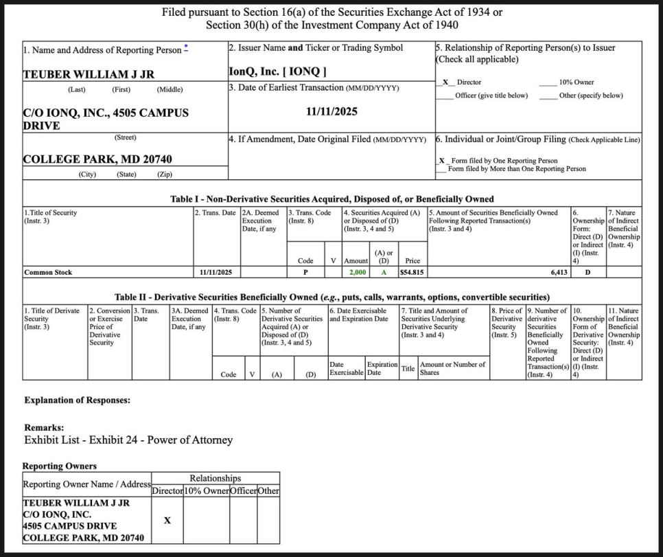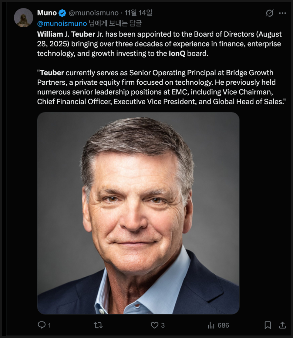 참고로 인사 얘기 나와서 덧붙이자면, 올해 아이온큐 이사회에 합류한 윌리엄 J. 튜버 주니어(William J. Teuber Jr.)가 IONQ 주식을 직접 매수했다는 소식이 있었습니다. 튜버는 금융·엔터프라이즈 기술·그로스 투자 분야에서 30년 넘게 활동해 온 베테랑인데, 브릿지 그로스 파트너스(Bridge Growth Partners)의 시니어 운영 파트너로 활동하고 있으며, 그 이전에는 EMC에서 부회장, 최고재무책임자, 영업 총괄 등 핵심 직책을 두루 맡았다고 합니다.