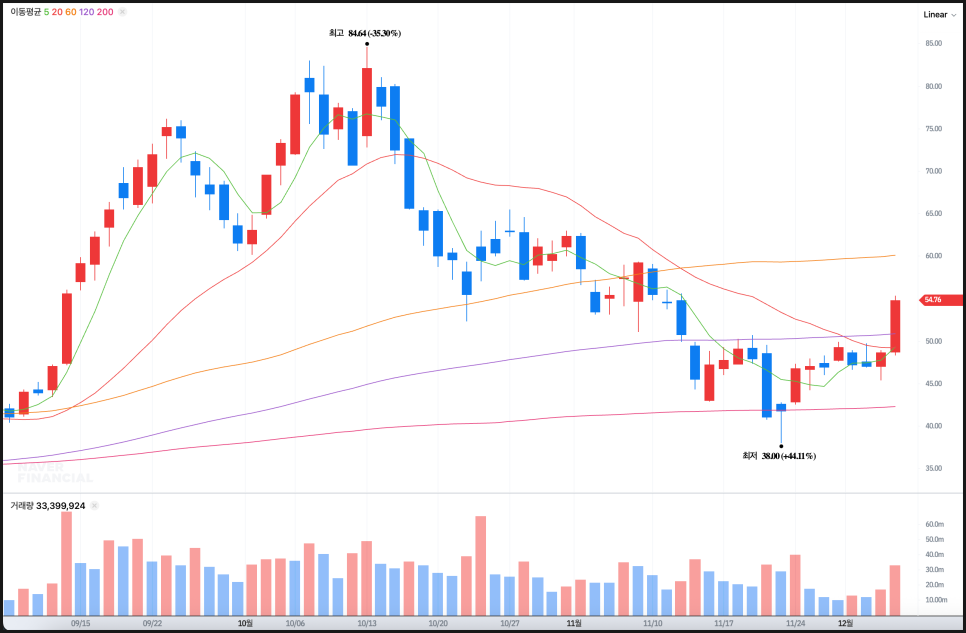 최근에 꽤나 강한 반등세를 보여주고 있습니다. 고점 대비 반토막이 났다가 11월 말에 저점을 찍고 40% 이상 상승하고 있는데요.