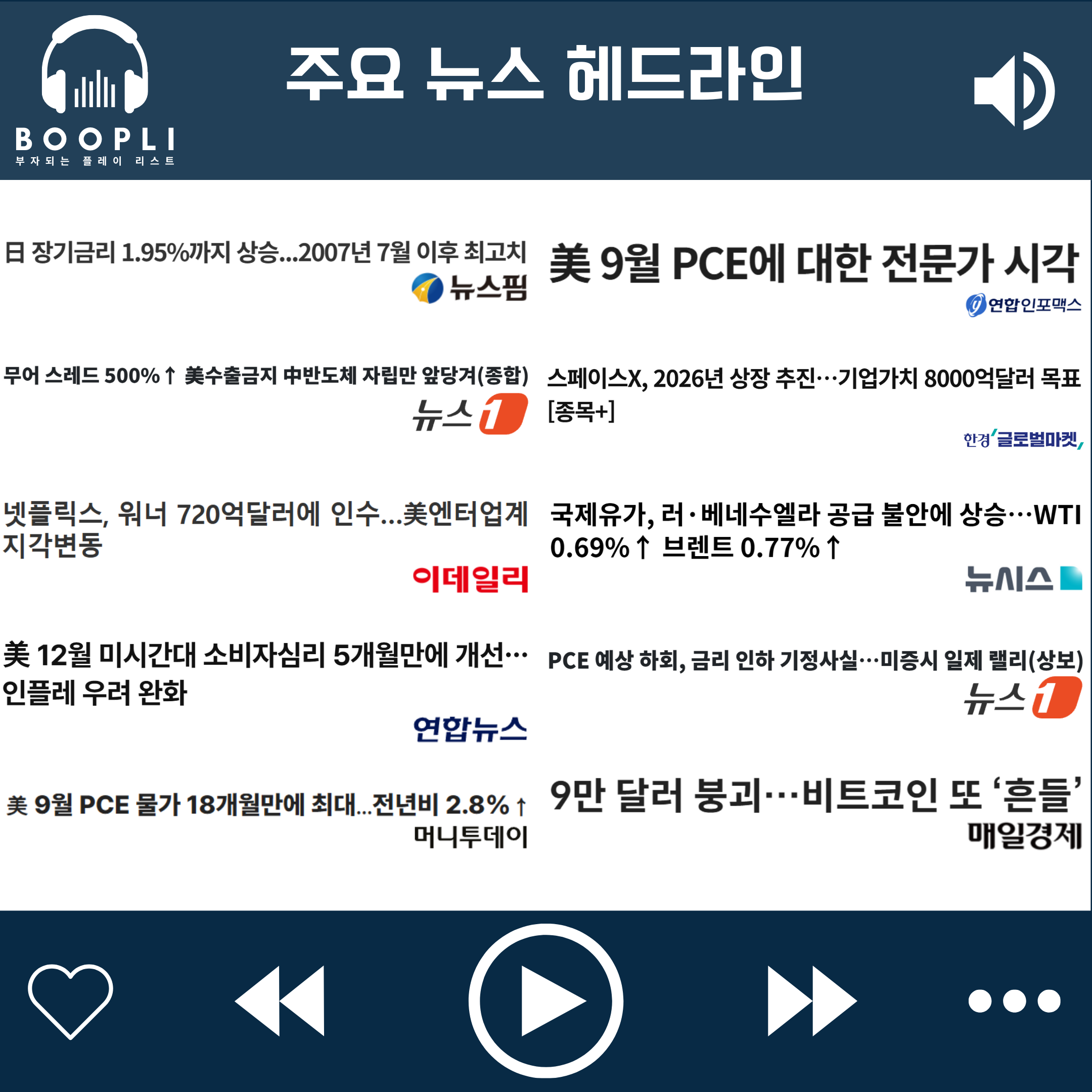 9월 PCE 물가지수는 전년 대비 2.8%로 예상과 일치해 12월 금리 인하 기대는 유지되었으나, 헤드라인 PCE가 18개월 만에 최고치를 기록하면서 2026년 금리 인하 속도 조절 우려가 부각됨