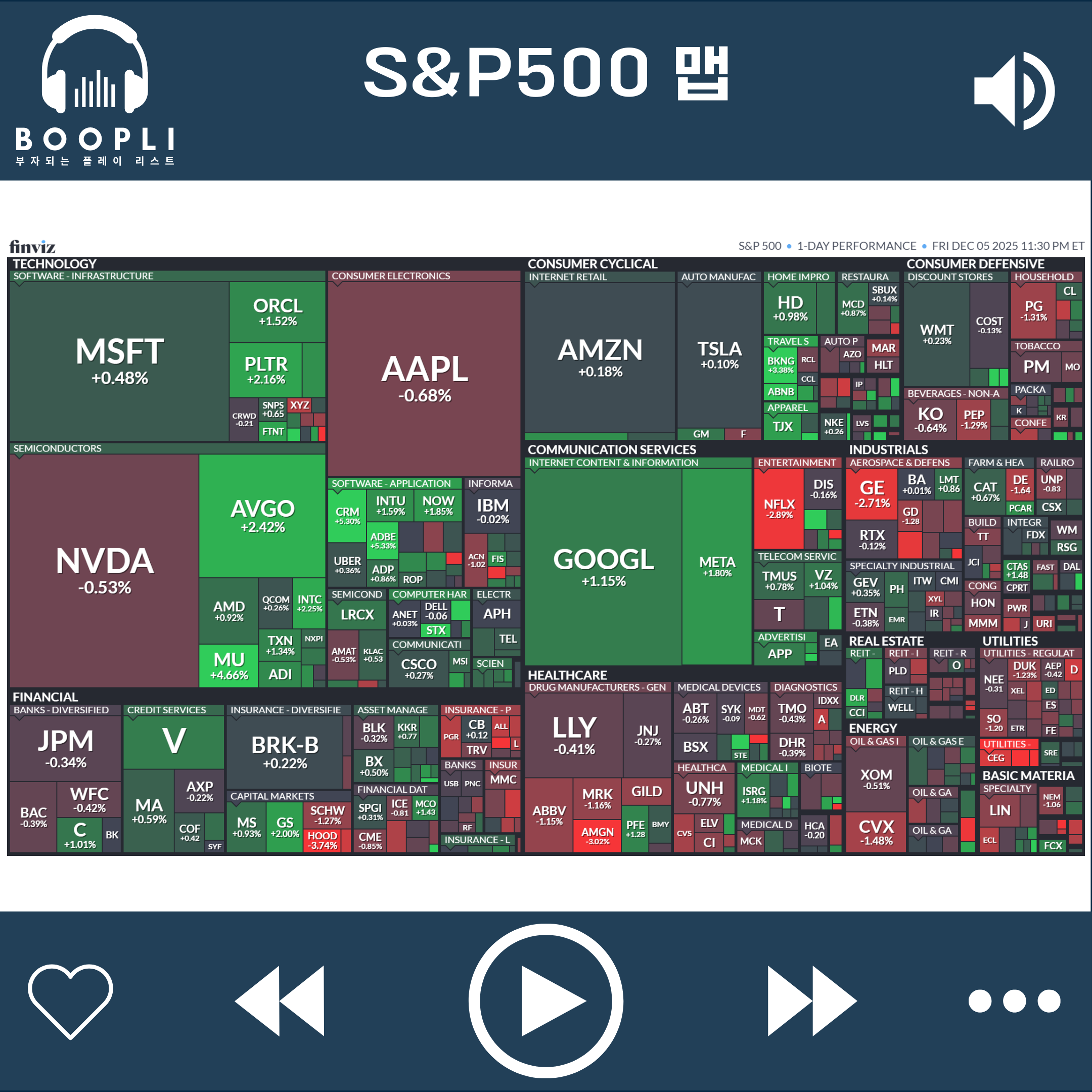 기술주에서는 중국 반도체 자립 우려가 부각되자 엔비디아가 하락한 반면, 알파벳·메타·브로드컴 등 구글 TPU 관련 종목들이 강세를 보이며 업종 내 차별화 흐름이 나타남