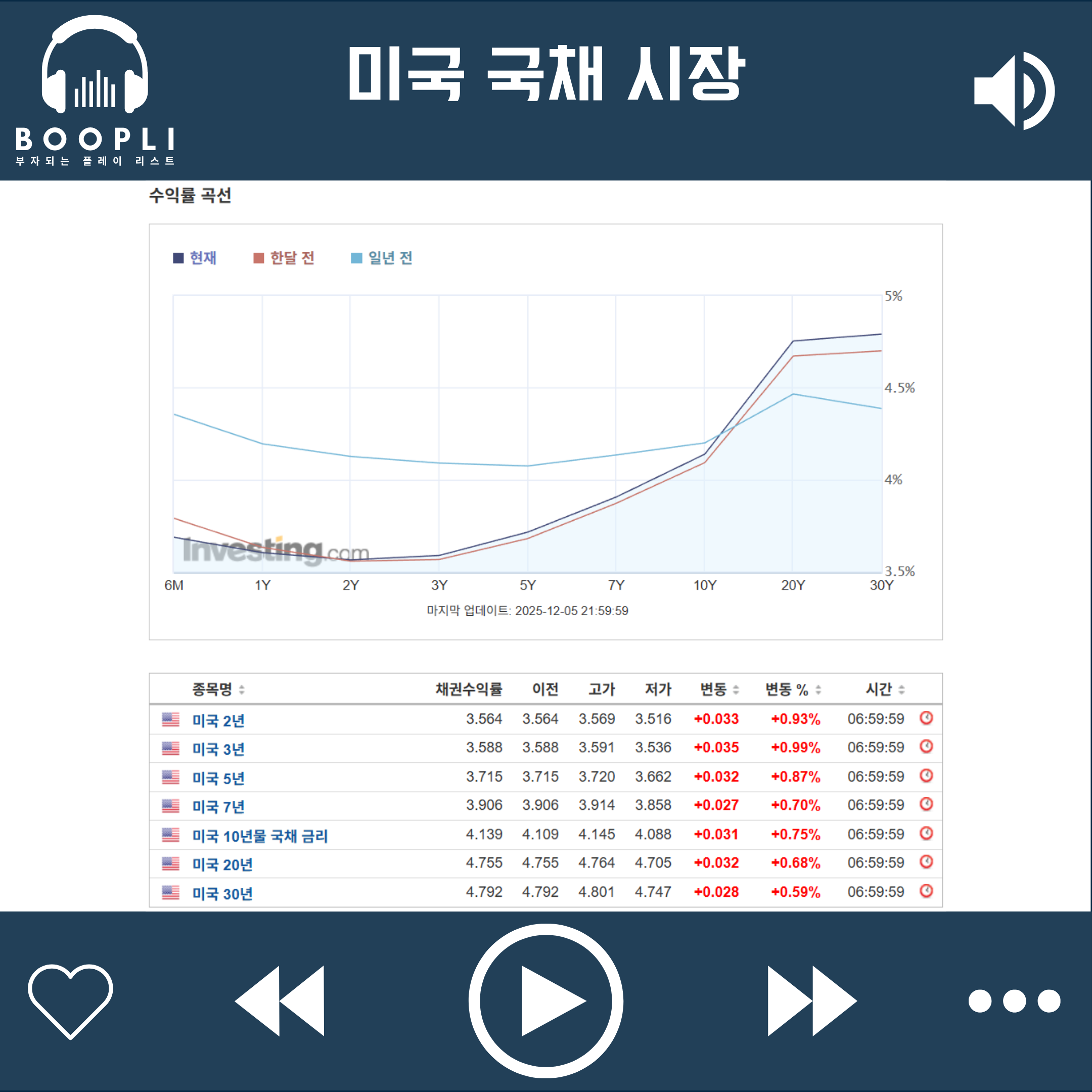 미국 국채는 일본은행(BOJ)의 금리 인상 기대로 일본 국채 상승에 동조하고, 9월 PCE 물가지수가 예상치에 부합했으나 18개월 만에 최고치를 기록하면서 2026년 금리 인하 속도 조절 우려가 부각되자 장단기 금리 모두 상승