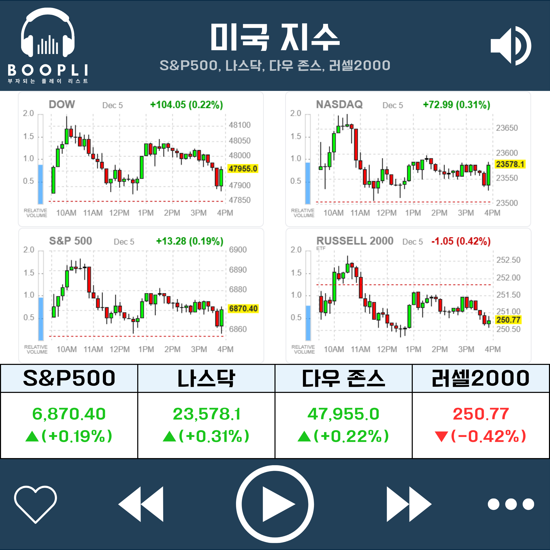 전일 미국 증시는 9월 PCE 물가지수가 시장 예상에 부합하며 연준의 12월 금리 인하 기대를 뒷받침했으나, FOMC를 앞둔 경계감과 2026년 금리 경로에 대한 불확실성이 부각되며 다우(+0.22%), S&P500(+0.19%), 나스닥(+0.31%)은 강보합, 러셀2000(-0.42%)은 약보합으로 혼조 마감