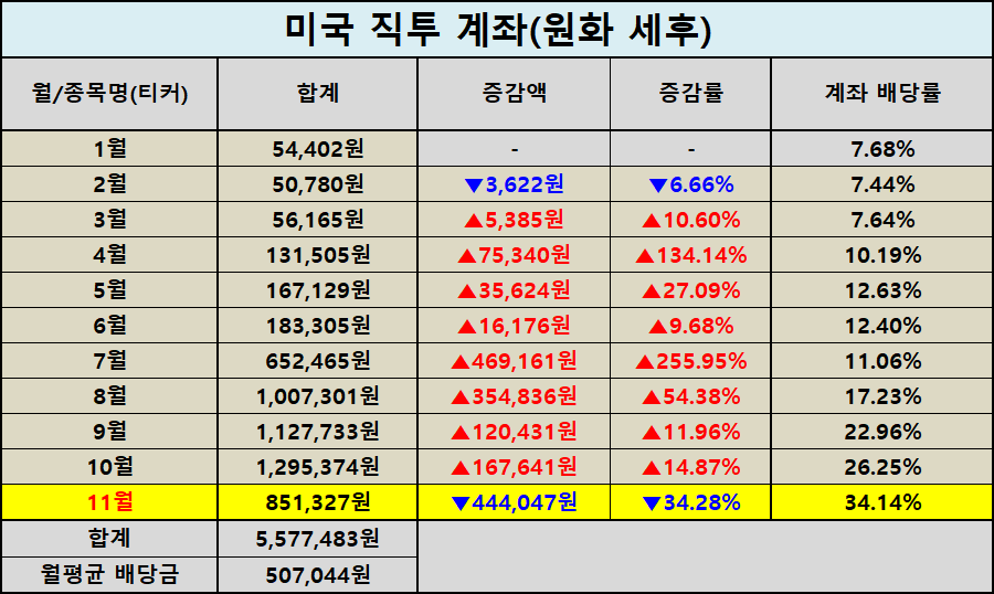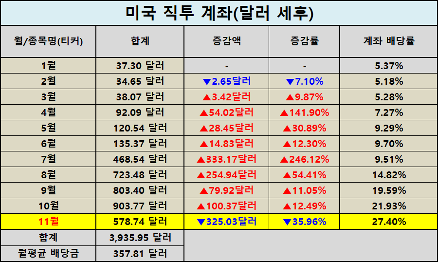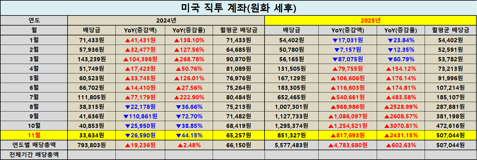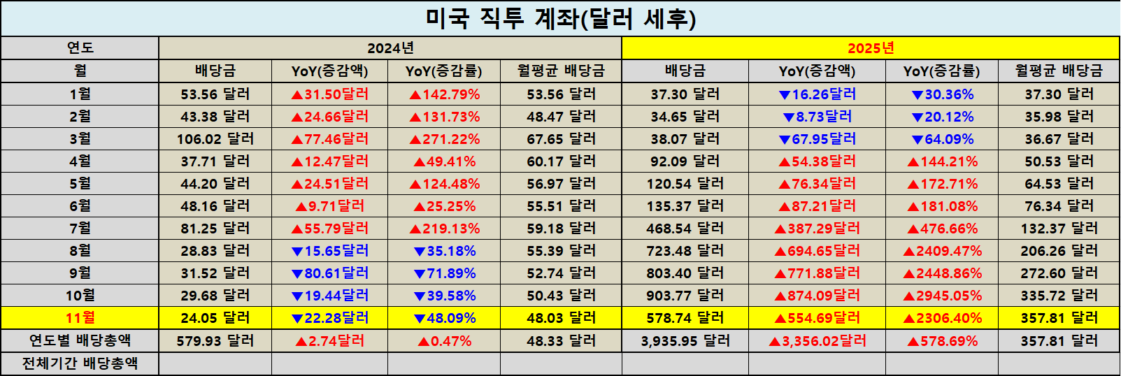 미국 직투 계좌는 11월에만 851,327원을 받아 단일 계좌 중 가장 높은 배당 흐름을 보여주었고 전년 대비 800,000원을 넘는 증가 폭을 기록했습니다. 달러 기준으로도 578.74달러를 수령하며 동일한 방향의 성장을 확인할 수 있었습니다. 성장률만 놓고 보면 매우 인상적이었고 배당 규모는 과거와 비교할 수 없을 만큼 커졌습니다.